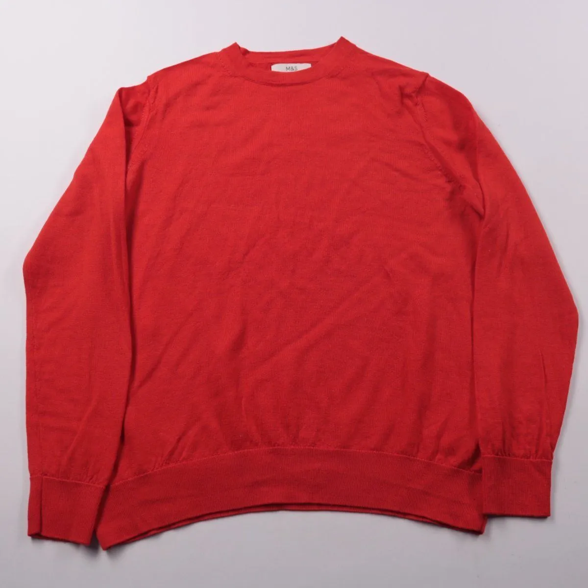 Джемпер M&S из тонкой мериносовой шерсти, красного цвета, с круглым вырезом и манжетами на рукавах. Подойдёт для офиса и повседневных образов в прохладную погоду, удобно носить как самостоятельный слой или под жакет. Меринос мягкий и хорошо держит тепло при небольшой толщине.
