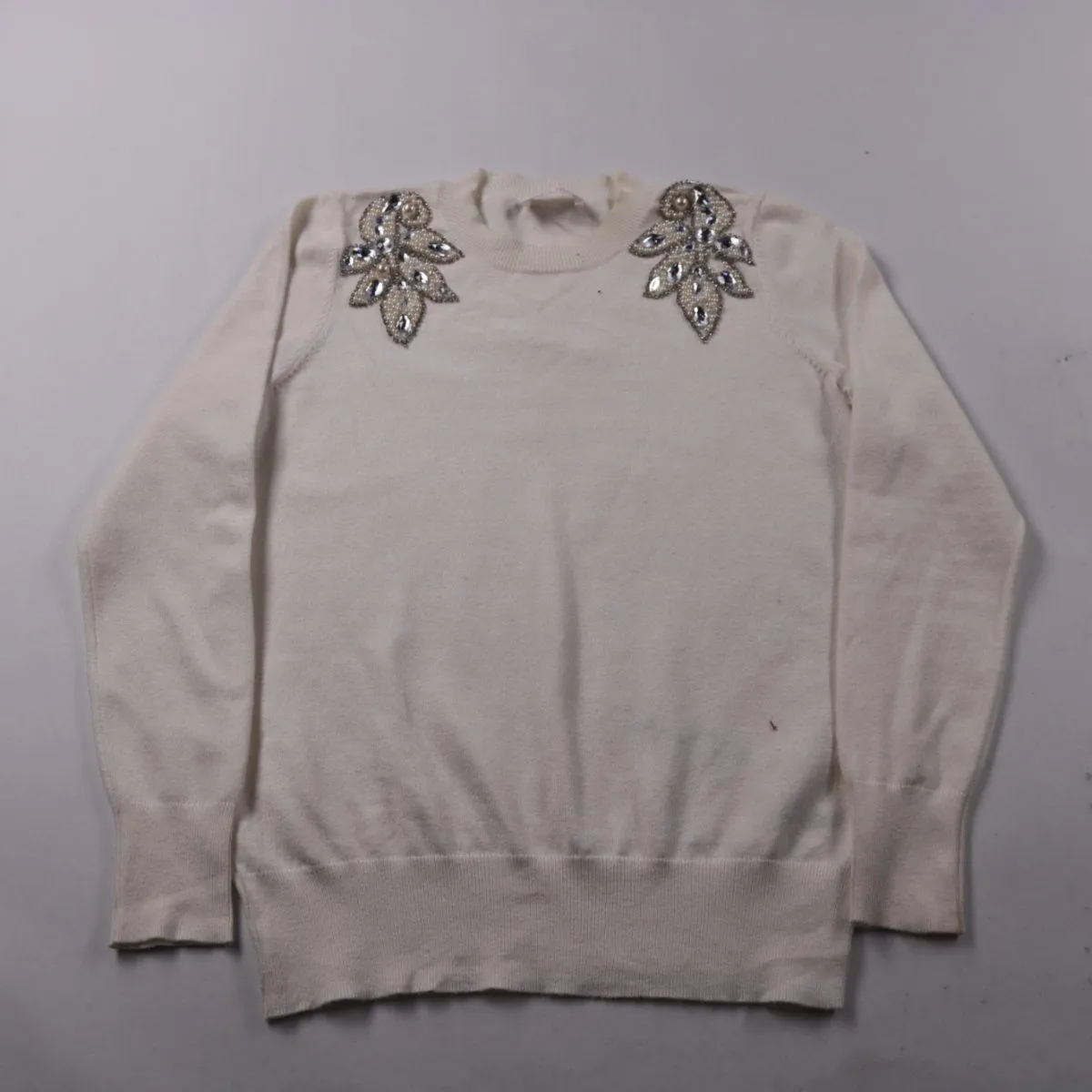 Джемпер Savida молочного оттенка с декором из страз на плечах и круглым вырезом. Подойдёт для повседневных и более аккуратных образов в прохладную погоду. Хорошо сочетается с джинсами и юбками и не требует сложного ухода.