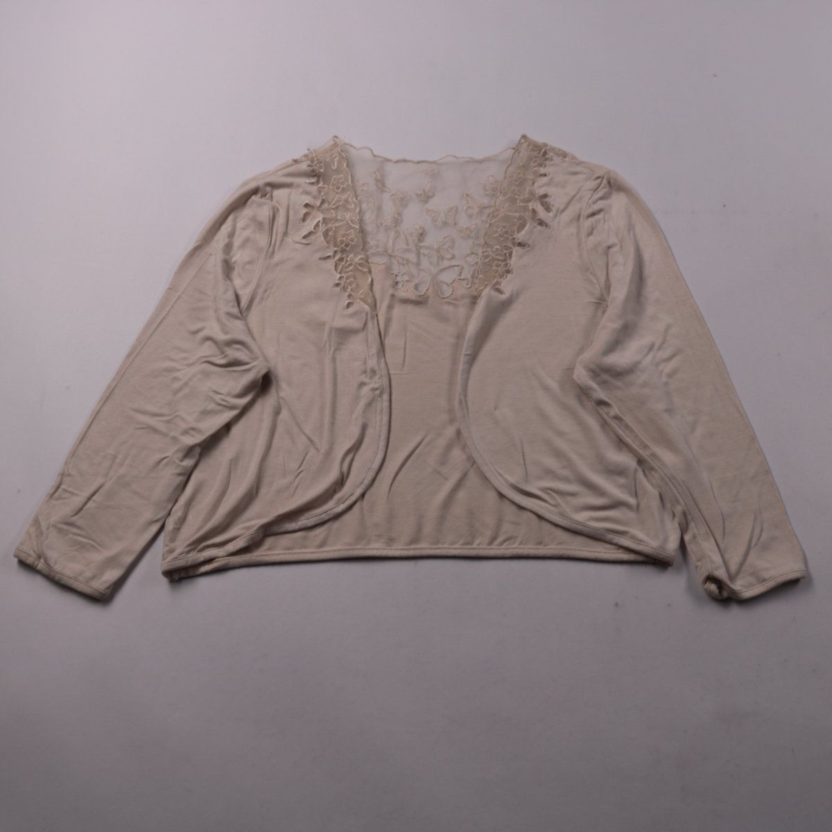 Женский кардиган Dunnes Stores бежевого цвета с кружевной вставкой по линии выреза. Подойдёт для повседневных образов и как лёгкий верхний слой в помещении или в тёплую погоду. Мягкая эластичная ткань хорошо тянется и комфортно садится по фигуре.