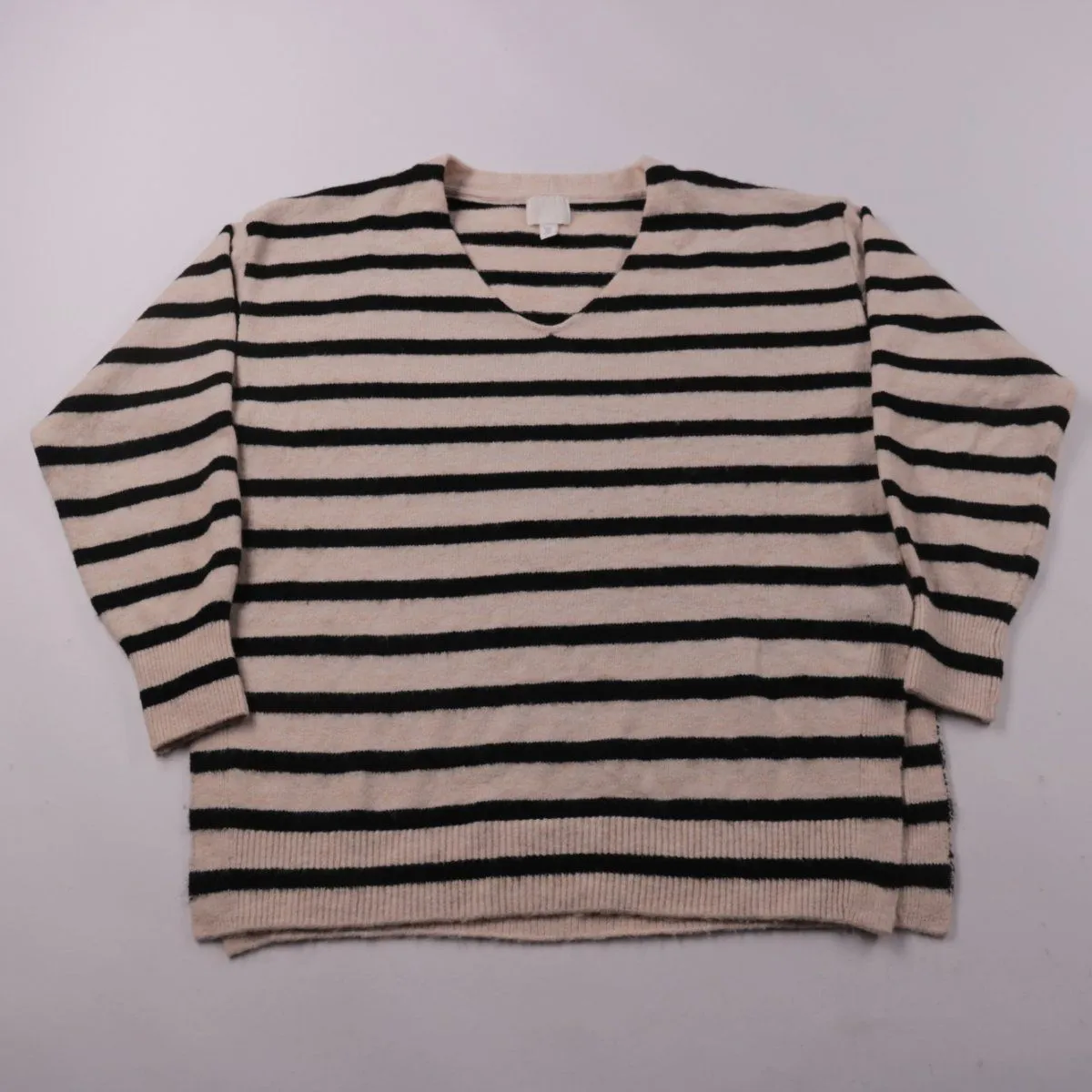 Джемпер H&M в бежево-чёрную полоску с V-образным вырезом и длинным рукавом. Подойдёт для повседневных образов в офис или на прогулку в прохладную погоду. Смесовая пряжа с добавлением эластана даёт мягкость и небольшую эластичность в носке.