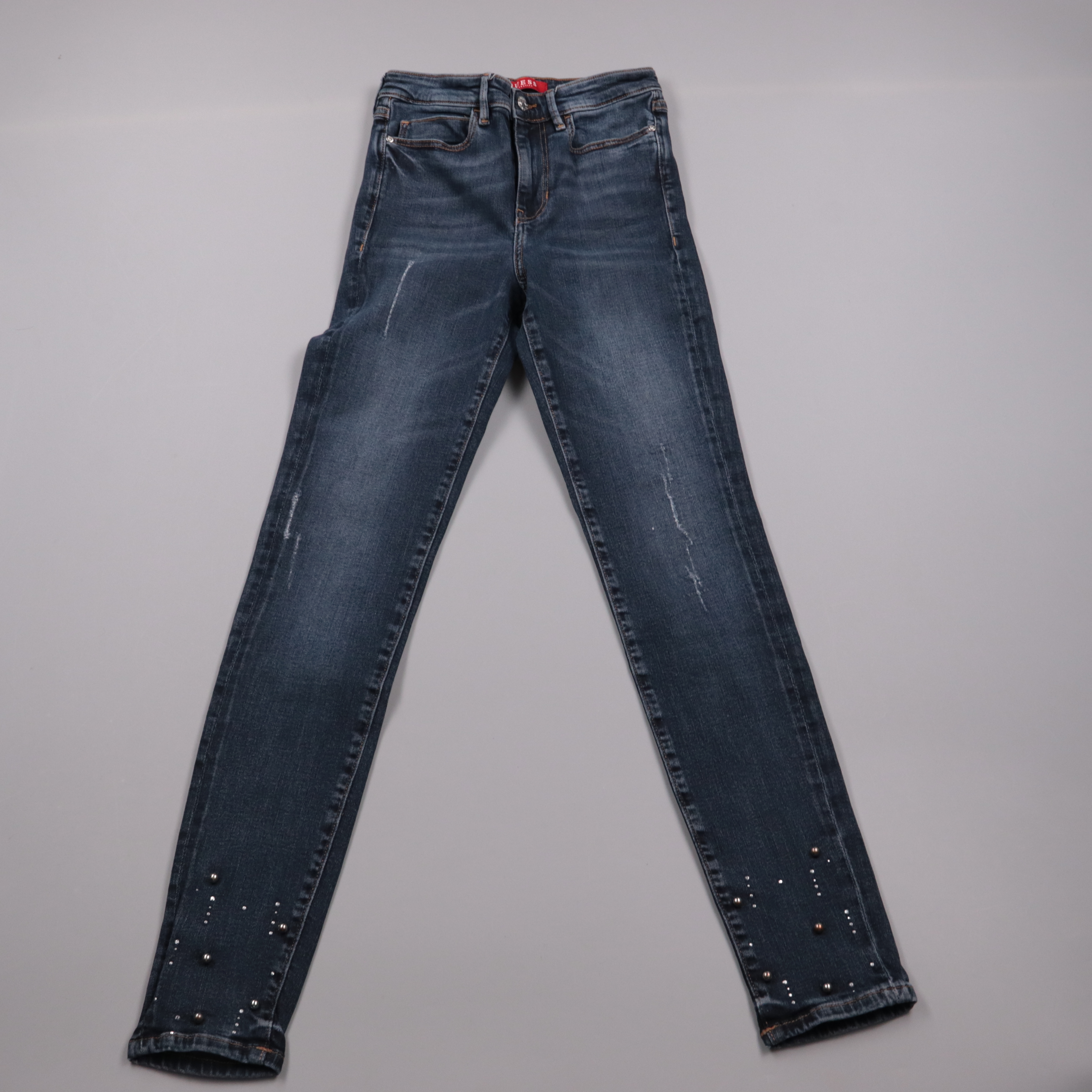 Женские джинсы Guess Skinny High из тёмно-синего денима с высокой посадкой и зауженным кроем. Подойдут на каждый день и для образов с жакетом или свитером, декоративные заклёпки внизу добавляют акцент. Плотная ткань хорошо держит форму и комфортно сади...