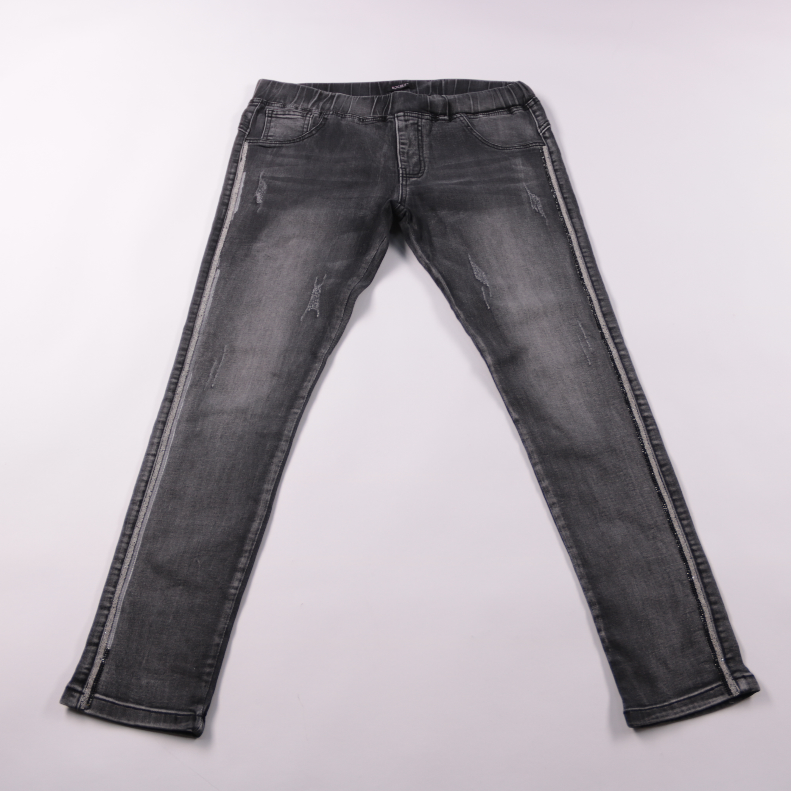 Женские джинсы Exsy Italia из серого денима с эффектом варки и декоративными лампасами по бокам. Подойдут для повседневных образов с кроссовками или ботинками в любой сезон. Эластичный пояс обеспечивает более комфортную посадку и не стесняет движения.