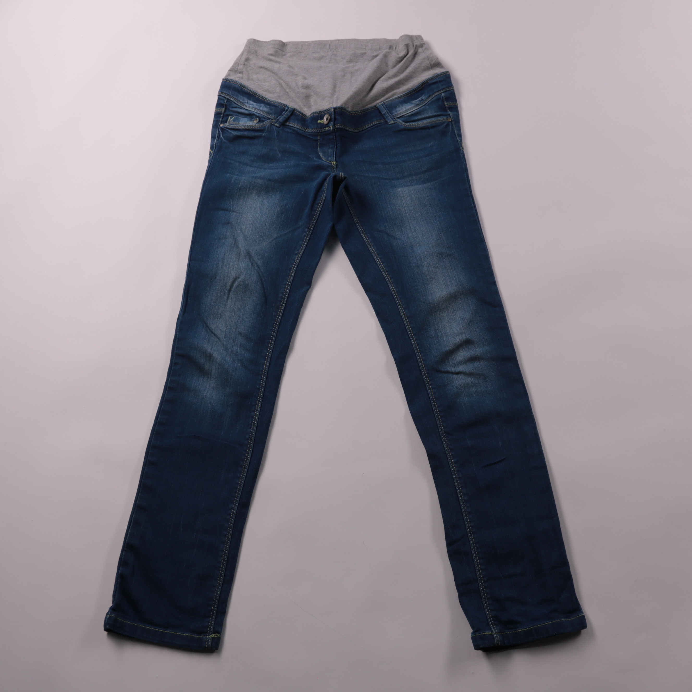Женские джинсы Yessica из синего денима с эластичной вставкой на поясе. Подойдут для повседневной носки и комфортны во время беременности благодаря мягкому трикотажному поясу. Практичны тем, что хорошо тянутся и не сковывают движения.