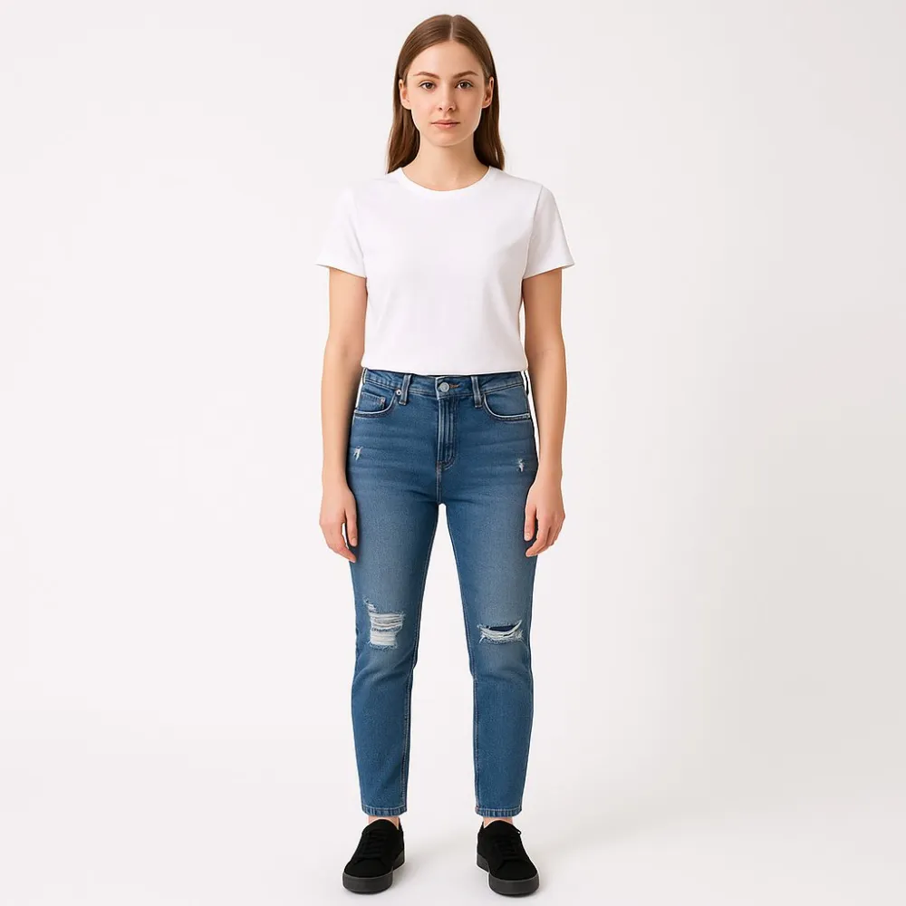 Женские джинсы Primark из денима с лёгкими потертостями и небольшими разрывами на коленях. Подойдут для повседневных образов с футболками, худи и кедами в любое время года. Ткань со стрейчем хорошо садится по фигуре и не сковывает движения.