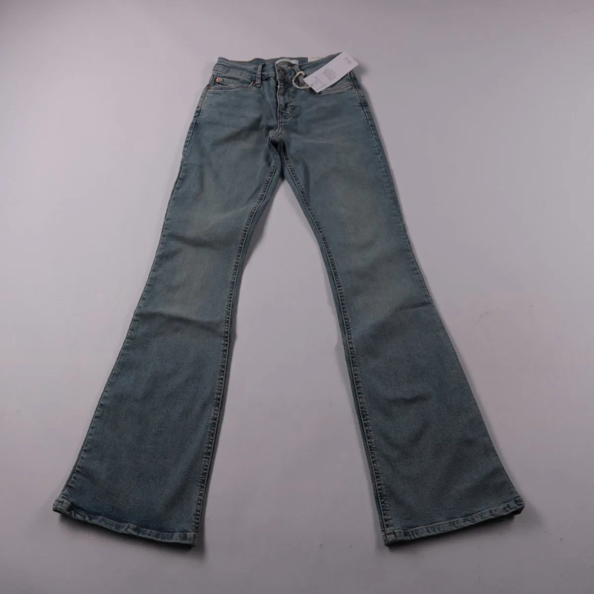 Женские джинсы Gina Tricot модели low waist bootcut в голубом дениме. Подойдут для повседневных образов и обуви на каблуке или платформе. За счёт добавления эластана ткань чуть тянется и комфортнее садится по фигуре.