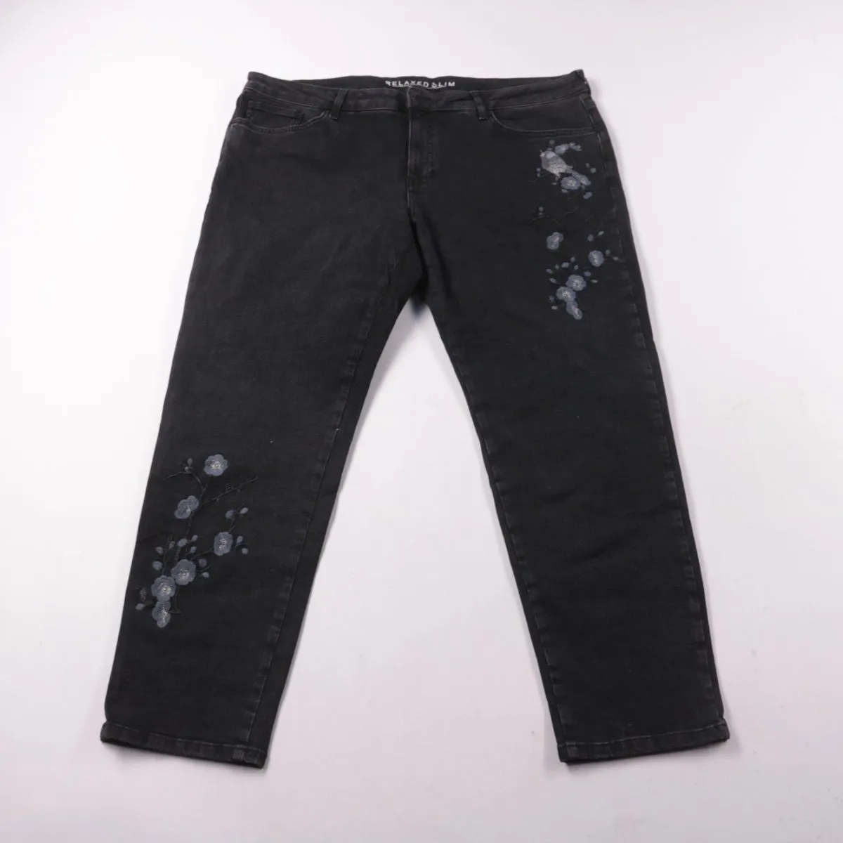 Женские джинсы M&S в черном цвете с посадкой relaxed slim и цветочным принтом на штанинах. Подойдут для повседневных образов и прогулок, хорошо сочетаются с базовыми футболками и свитерами. Ткань с добавлением эластана немного тянется и комфортнее сидит в движении.