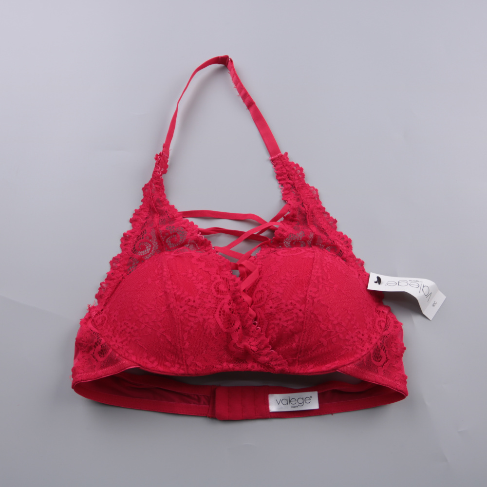 Кружевной бюстгальтер Valege ярко-красного цвета с декоративной шнуровкой спереди и бретелью через шею. Подойдёт для повседневной носки и как акцент под открытые топы или платья. Мягкий материал хорошо тянется и комфортно садится по фигуре.