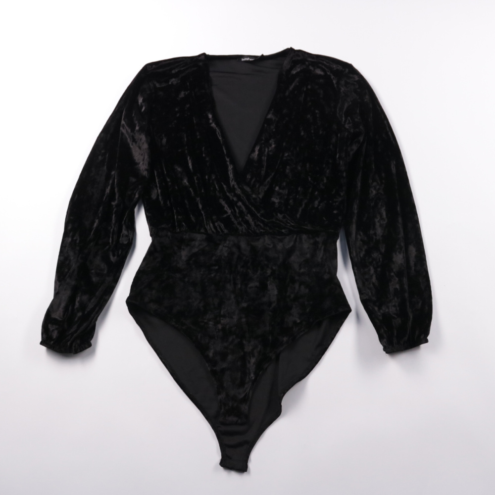 Бархатное боди Boohoo чёрного цвета с длинными рукавами и V-образным запахом. Подойдёт для вечерних выходов и как акцентный верх под жакет или юбку с высокой посадкой. Эластичный материал хорошо тянется и комфортно садится по фигуре.