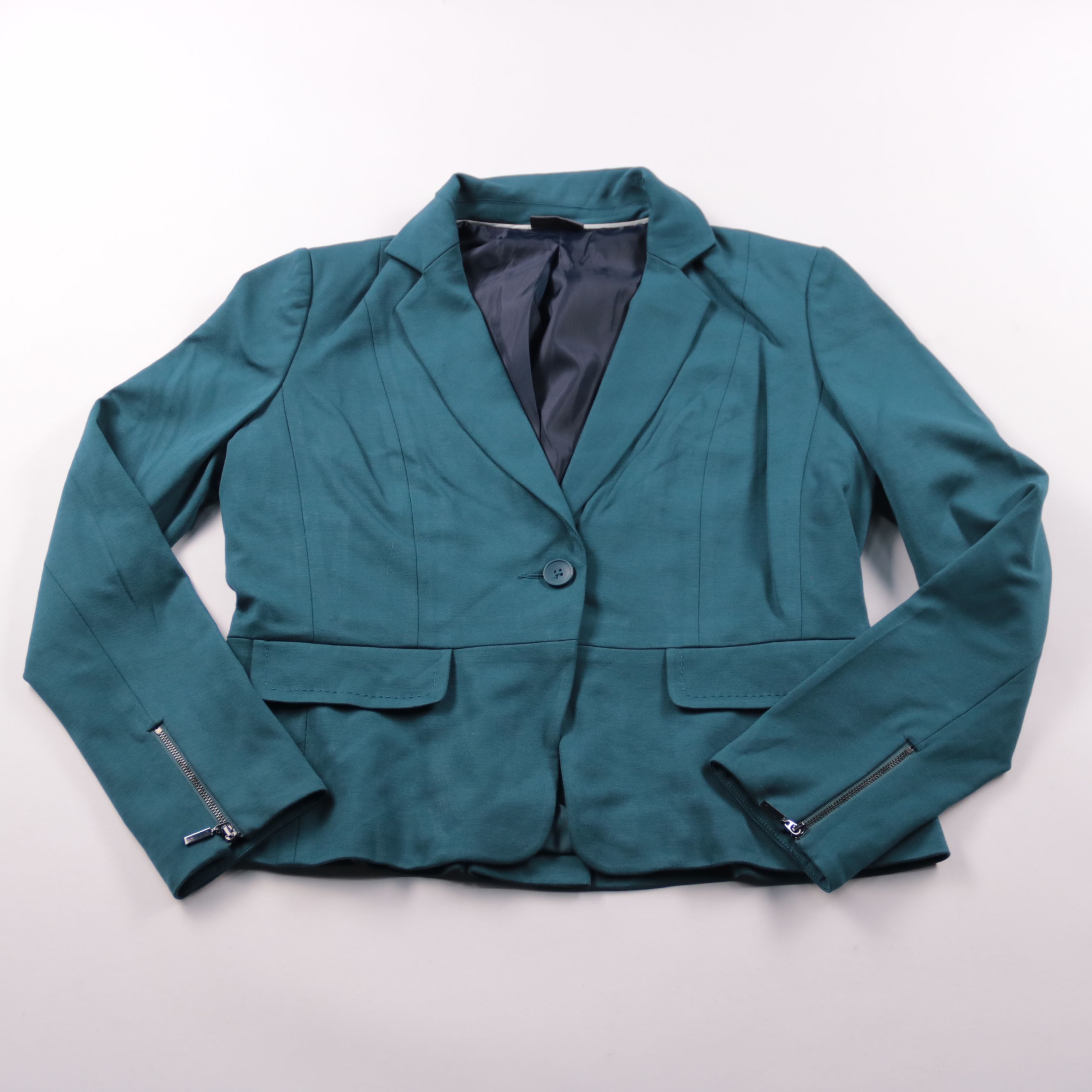 Женский пиджак Yessica в бирюзово-зелёном оттенке, приталенного кроя, на одной пуговице и с молниями на манжетах. Подойдёт для офиса и повседневных образов с платьем или брюками. Ткань с добавлением эластана комфортно садится и меньше мнётся.