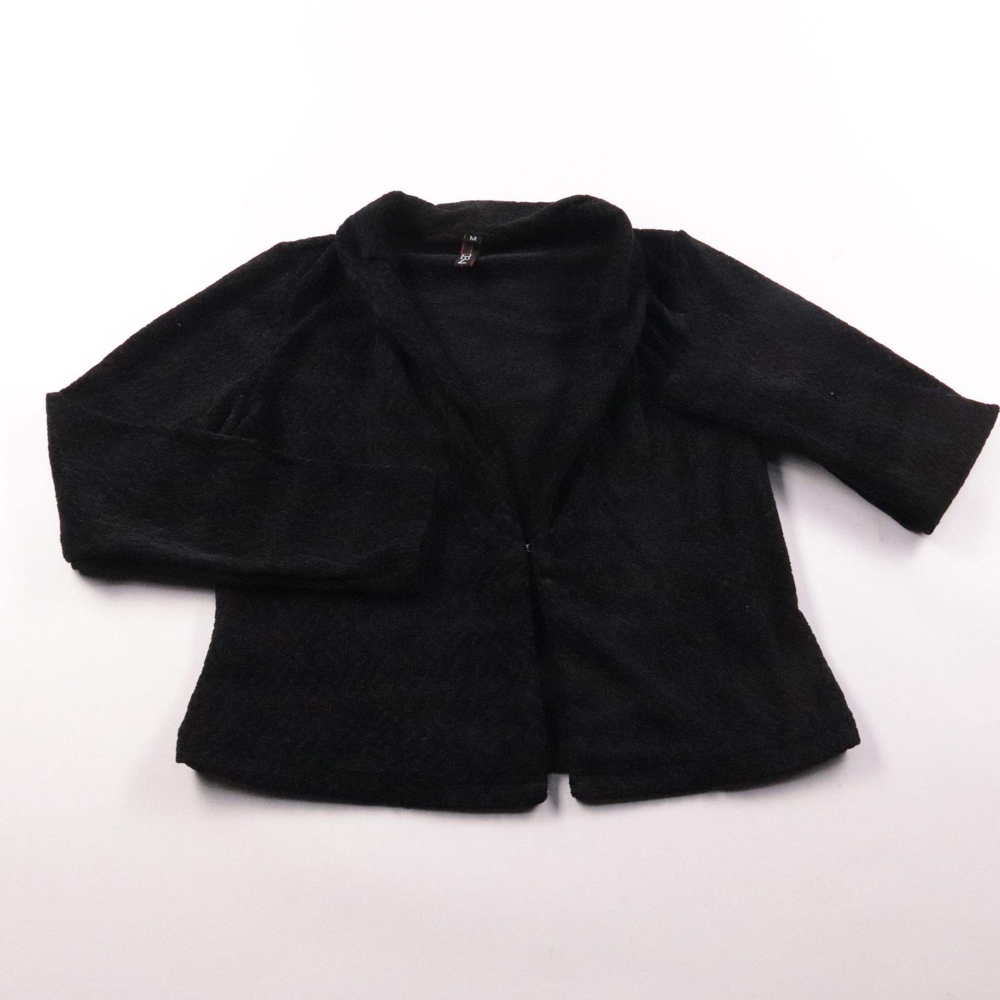 Чёрный женский пиджак NED из мягкого полиэстера, укороченный и без застёжки. Подойдёт для офиса и на выход — хорошо смотрится с платьем или брюками с высокой посадкой. Практичен в носке: ткань легко чистится и почти не мнётся.