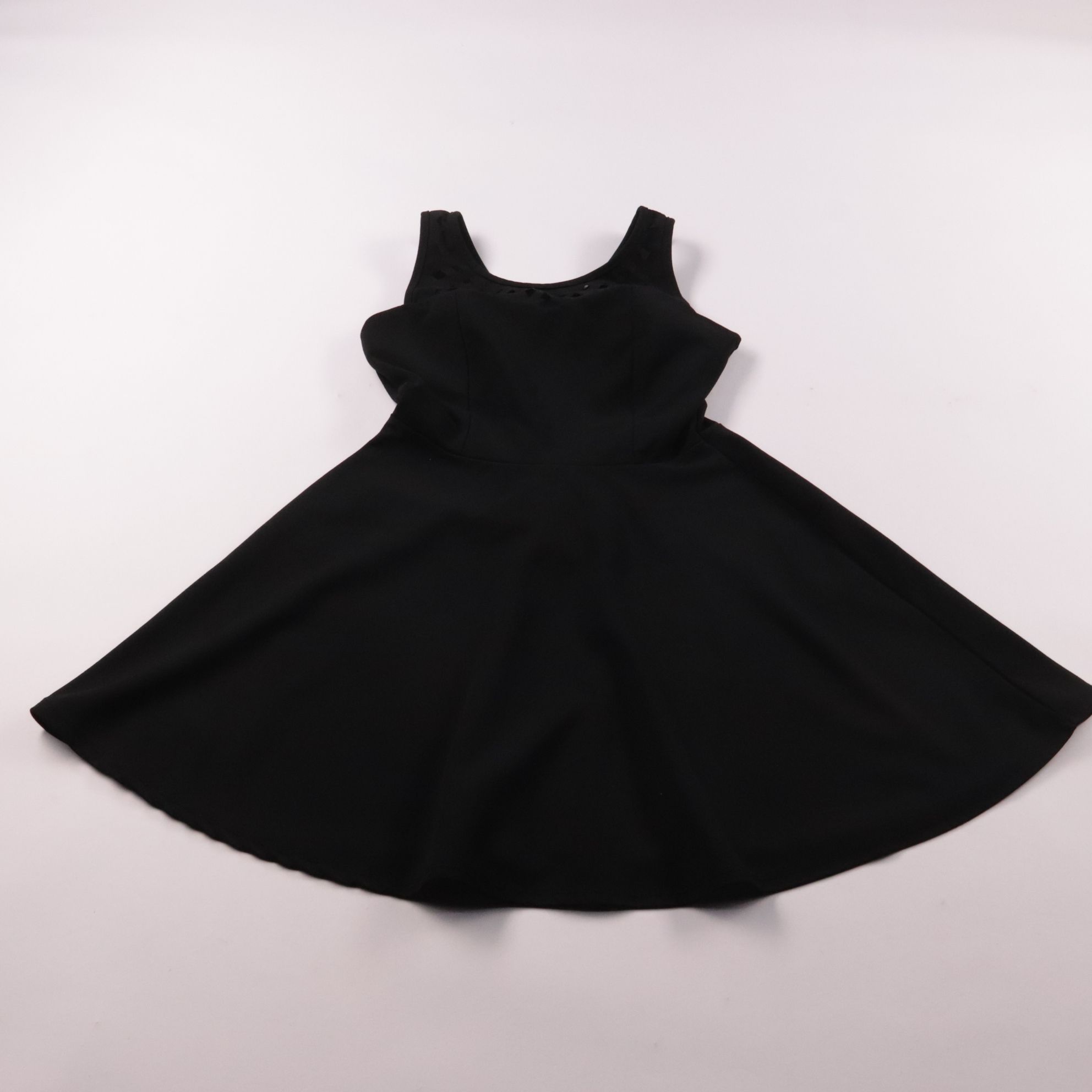 Чёрное женское платье без рукавов с округлым вырезом и расклешённой юбкой. Подойдёт для повседневных выходов и мероприятий в тёплое время года, хорошо смотрится с жакетом или кардиганом. Ткань со стрейчем лучше садится по фигуре и не стесняет движений.
