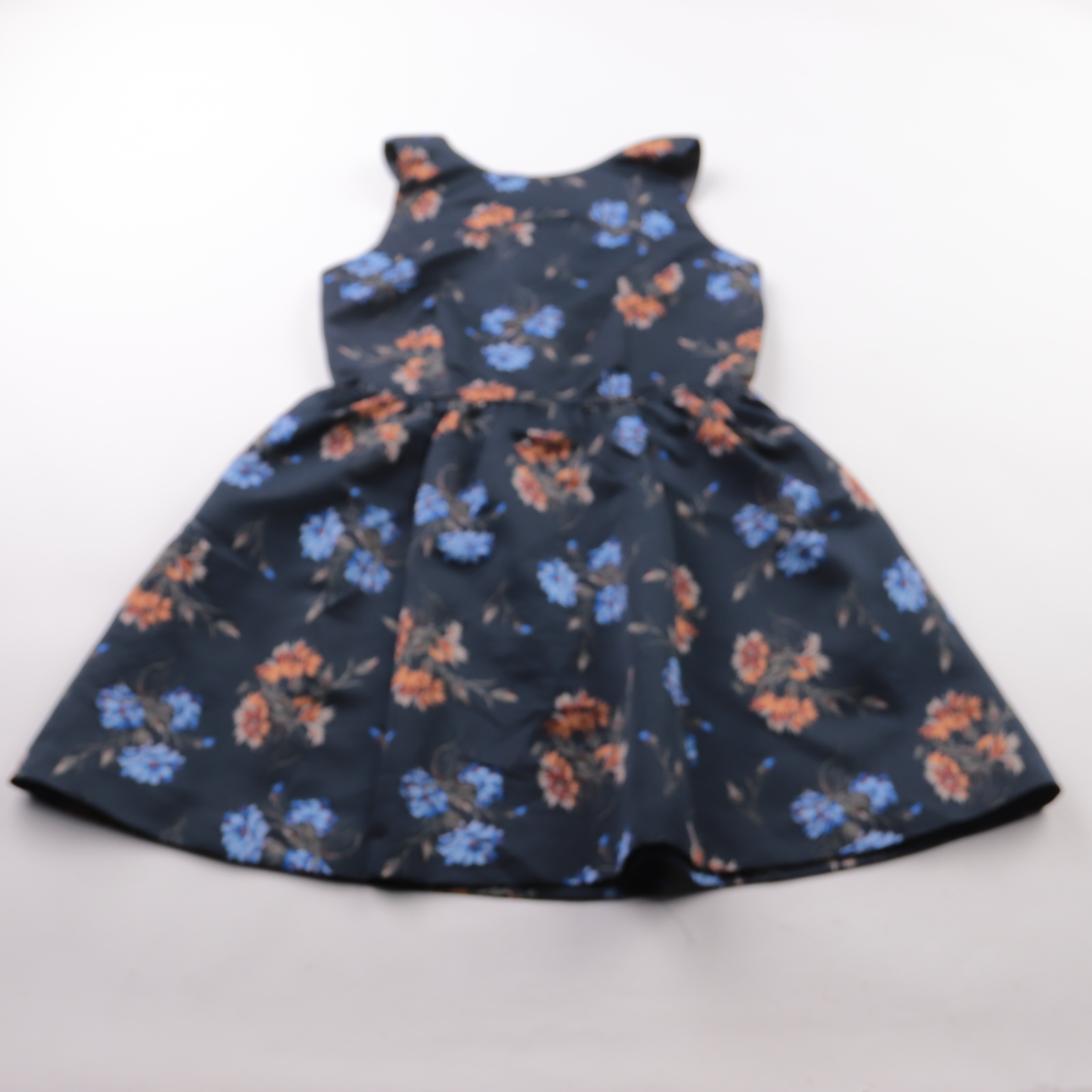 Повседневное платье Zara Basic тёмно-синего цвета с цветочным принтом и пышной юбкой. Подойдёт для прогулок, офиса или встреч, когда хочется аккуратный женственный образ. Плотная ткань держит форму, а подкладка делает посадку комфортнее.