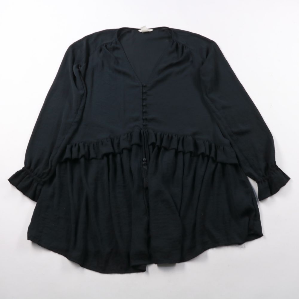 Чёрная блузка H&M с V-образным вырезом и застёжкой на пуговицы, с мягкой сборкой по линии талии и манжетами на резинке. Подойдёт для повседневных и офисных образов с брюками или юбкой в демисезон. Лёгкий полиэстер почти не мнётся и быстро сохнет.