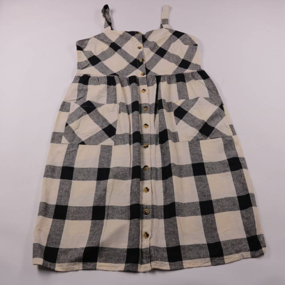 Повседневное платье-сарафан F&F в крупную клетку, на тонких бретелях и с застёжкой на пуговицы спереди. Подойдёт для тёплой погоды, прогулок и отдыха, легко сочетается с кедами или сандалиями. Ткань лёгкая и дышащая, удобно носить в жару.