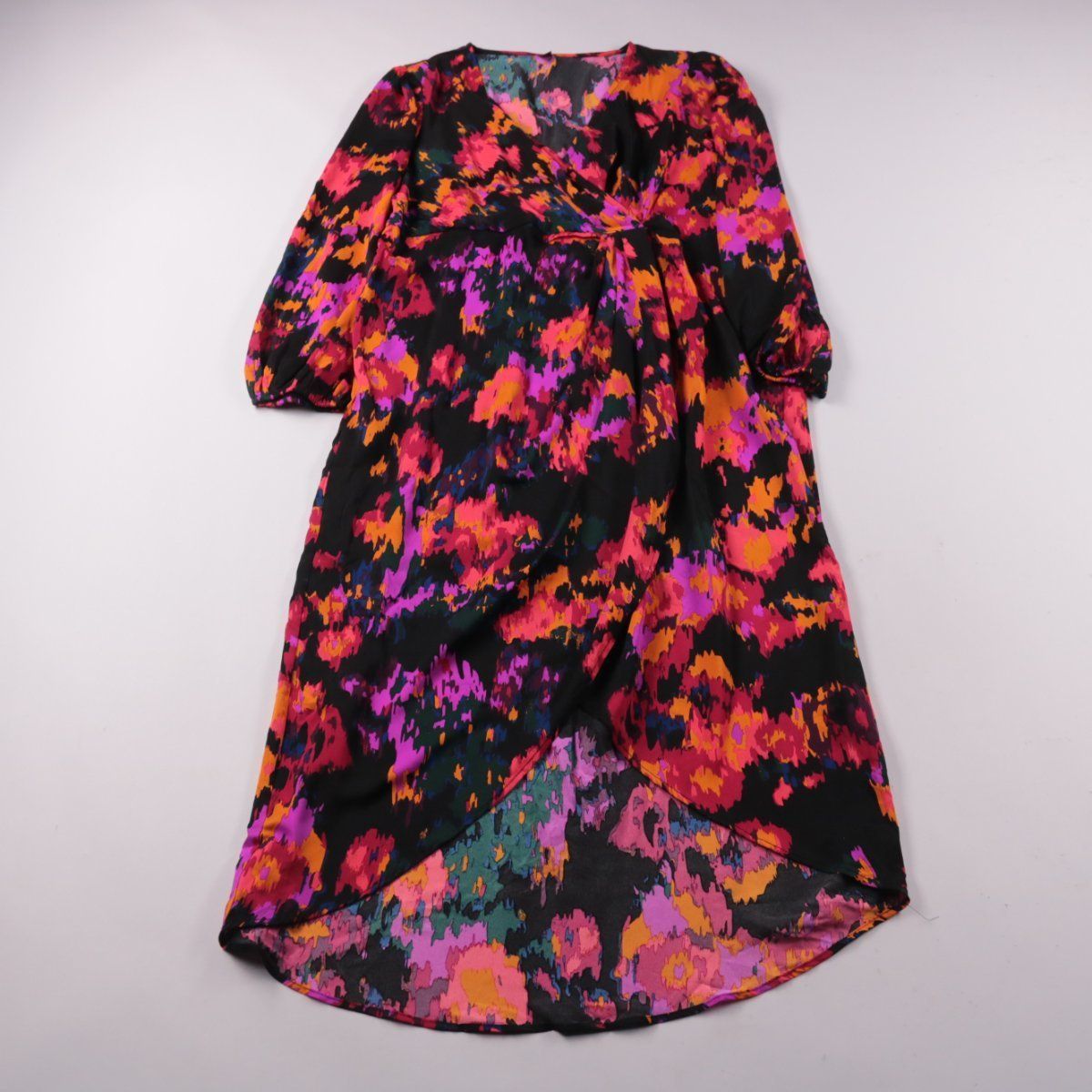 Повседневное платье Shein Curve с запахом и поясом на талии, с рукавами 3/4 и асимметричным подолом. Подойдёт для города и встреч, яркий абстрактный принт хорошо смотрится с однотонной обувью и аксессуарами. Практичное преимущество — ткань из полиэстера почти не мнётся и быстро сохнет.