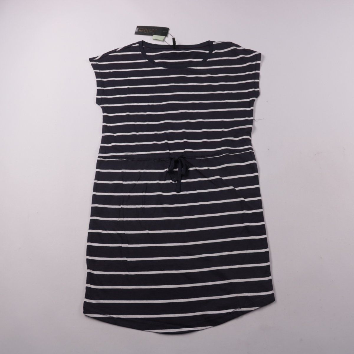 Повседневное платье ONLY в белую полоску на тёмно-синем фоне, с коротким рукавом и круглым вырезом. На талии кулиска с завязками — удобно регулировать посадку, подходит для прогулок и на каждый день. Натуральный хлопок хорошо дышит и комфортен в жаркую погоду.