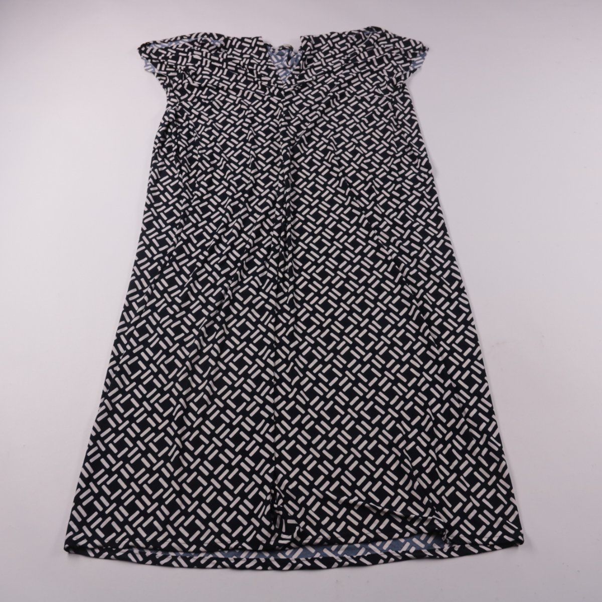 Повседневное платье Elements Yoga в чёрно-белый геометрический принт, с V‑вырезом и коротким рукавом. Подойдёт для летних прогулок и повседневных дел. Принт хорошо маскирует мелкие следы носки и легко сочетается с однотонной обувью и аксессуарами.