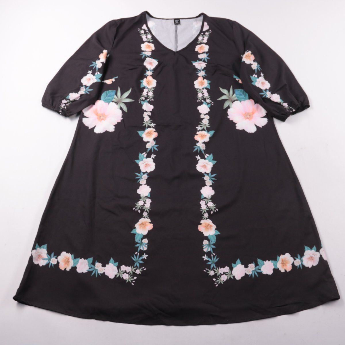 Повседневное платье SHEIN Curve свободного силуэта с V-образным вырезом и рукавами 3/4 на резинке, на чёрном фоне цветочный принт. Подойдёт для летних прогулок и повседневных выходов благодаря комфортной посадке. Практичный плюс — ткань из полиэстера проста в уходе и быстро сохнет.