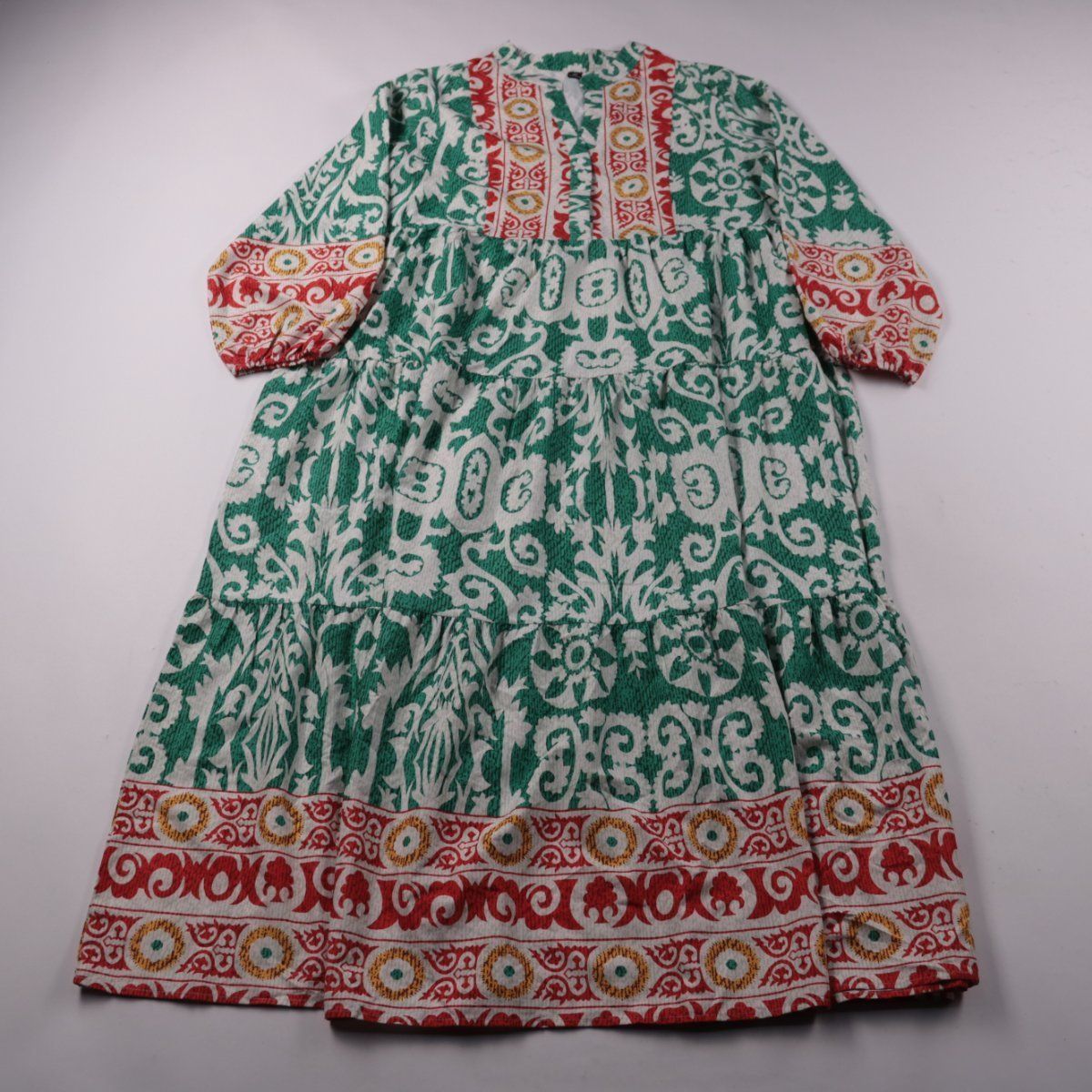 Повседневное платье Shein Curve с длинными рукавами и ярусной юбкой, ткань с ярким орнаментальным принтом. Подойдёт для прогулок и отдыха в тёплую погоду. Лёгкий полиэстер быстро сохнет и почти не мнётся.