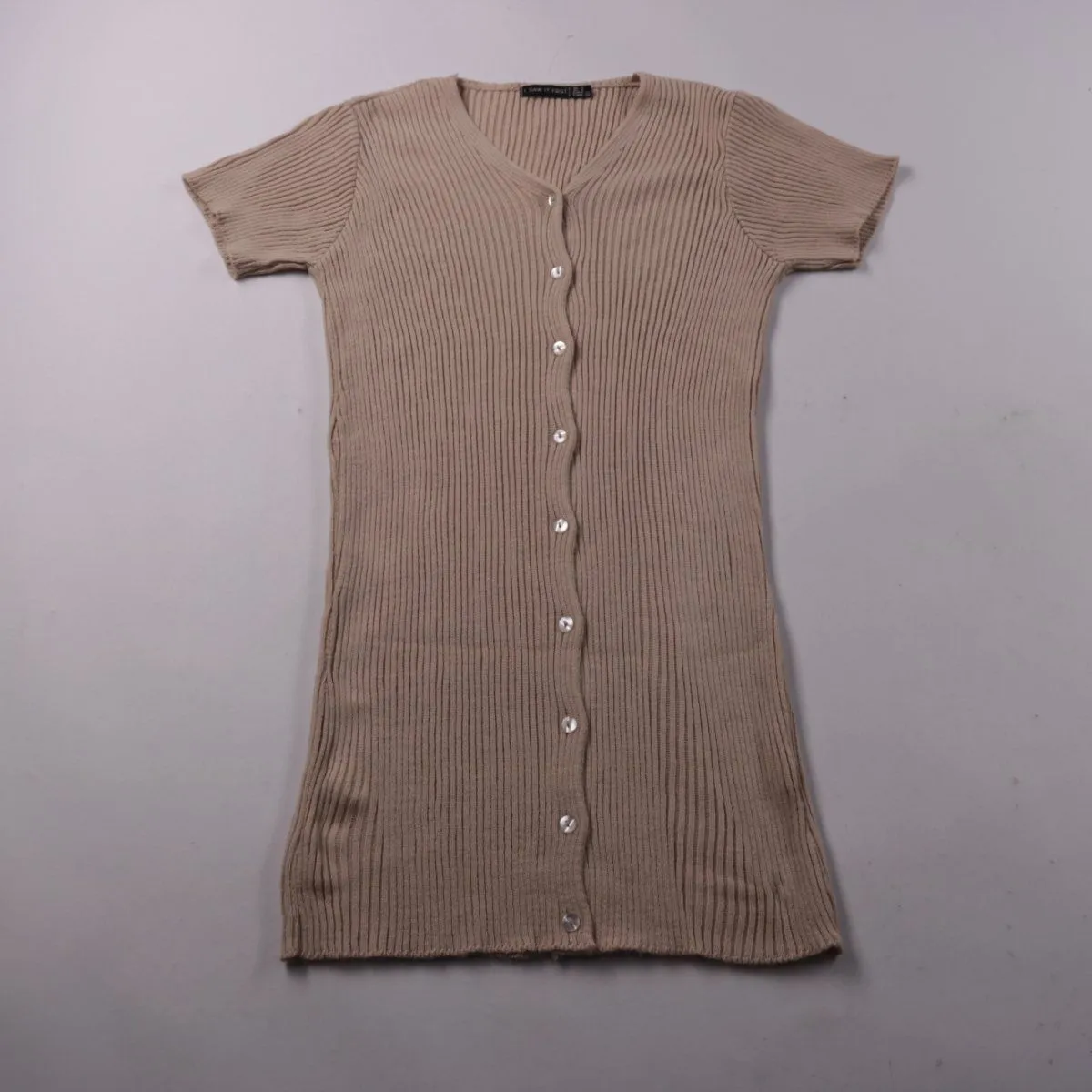 Повседневное трикотажное платье I SAW IT FIRST в бежевом цвете, в рубчик, с V-вырезом и застёжкой на пуговицы по всей длине. Подойдёт для повседневных образов и на выход в тёплую погоду, хорошо сочетается с кедами или ботинками. Практичный плюс — эластичный материал и пуговицы позволяют комфортно посадить по фигуре.