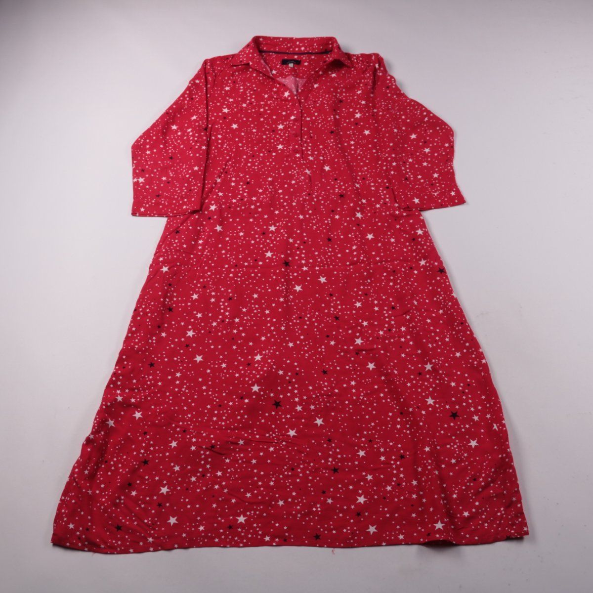 Повседневное платье Joules рубашечного кроя с длинным рукавом и воротником, красного цвета с принтом звёзд. Подойдёт для повседневной носки дома и на выход в тёплую погоду. Вискоза в составе делает ткань лёгкой и комфортной в носке.