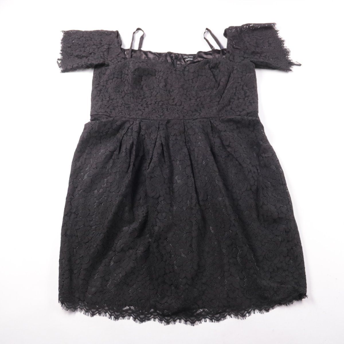 Женское вечернее платье City Chic из чёрного кружева с открытыми плечами и тонкими бретелями. Подойдёт для мероприятий и выхода в театр/ресторан, силуэт подчёркивает талию за счёт отрезной линии и мягких складок на юбке. Есть подкладка, поэтому ткань не просвечивает и комфортнее носится.