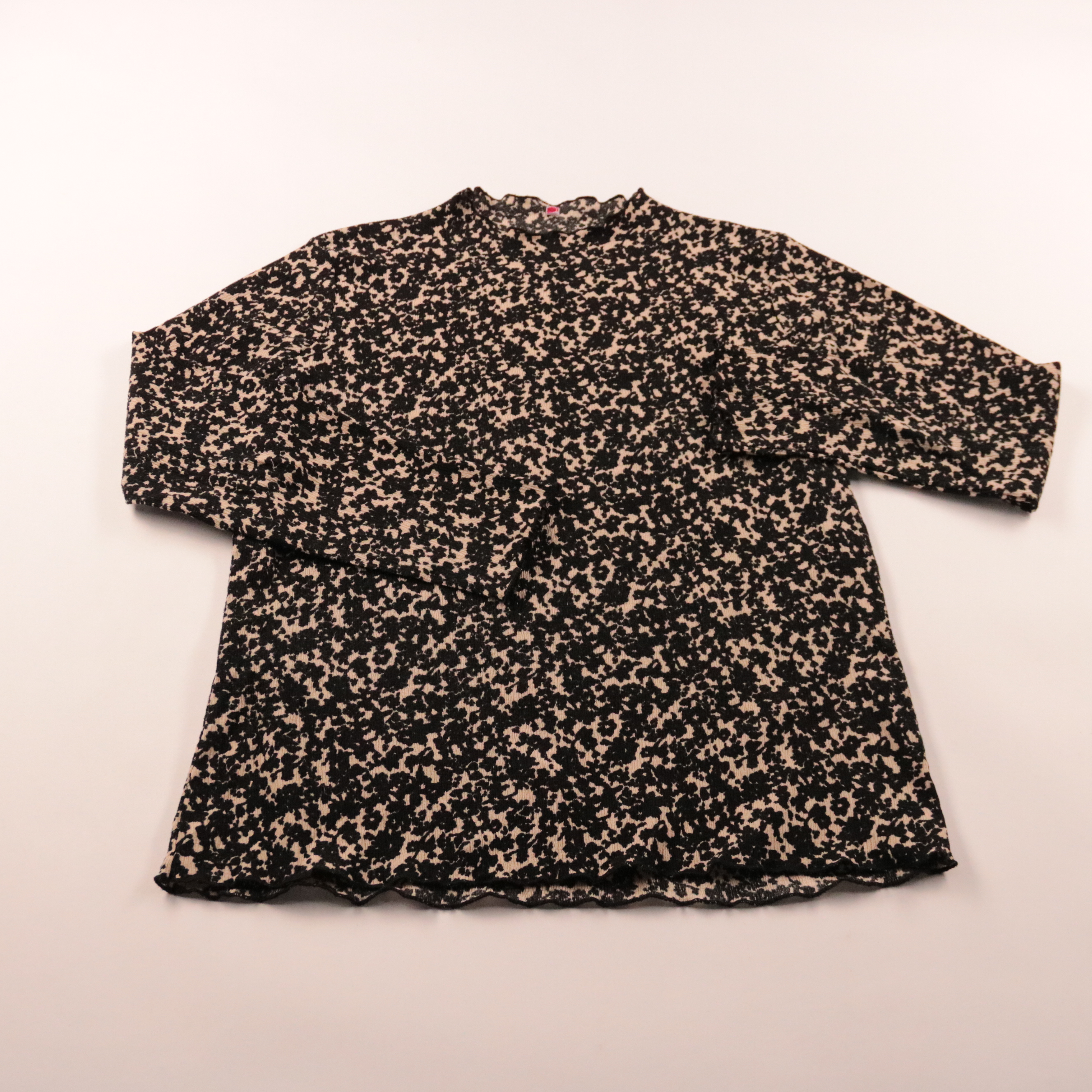 Блузка Miss E с длинным рукавом и высоким воротником, выполнена из фактурной ткани с черно-бежевым принтом. Подойдет для офиса и на каждый день, легко сочетается с брюками или юбкой. Материал слегка тянется и почти не мнется, удобно в носке.