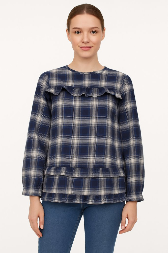Женская блузка Munthe в сине-белую клетку с воланами на груди и по низу. Подойдёт для офиса и повседневных образов в прохладную погоду, легко сочетается с джинсами или брюками. Практичный плюс — немнущаяся ткань со смесовым составом, за ней проще ухажи...