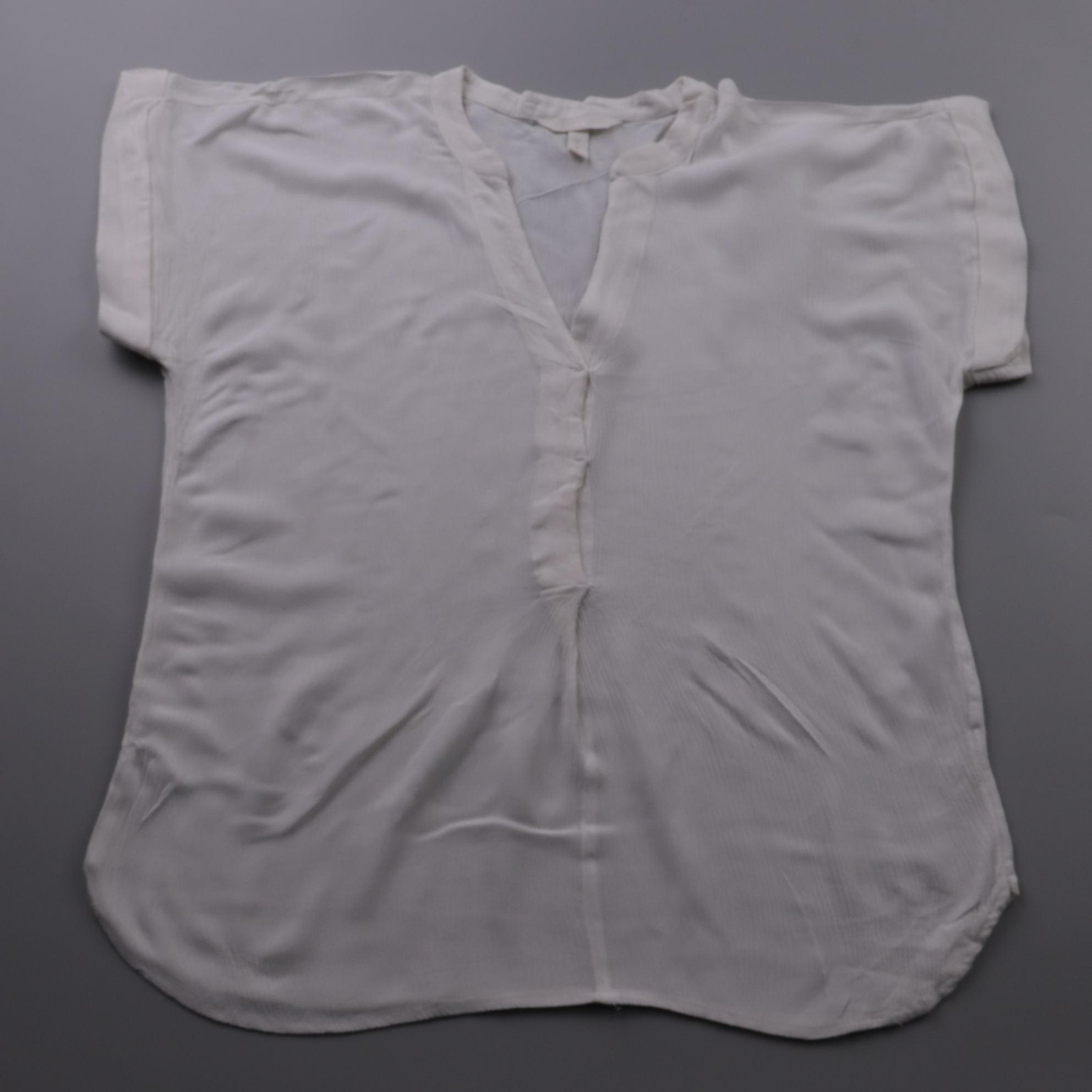 Белая блузка H&M из лёгкой ткани с коротким рукавом и V‑вырезом с планкой. Подойдёт для офиса и на каждый день, хорошо сочетается с джинсами или юбкой. Ткань тонкая и дышащая, удобно носить в тёплое время или под жакет.