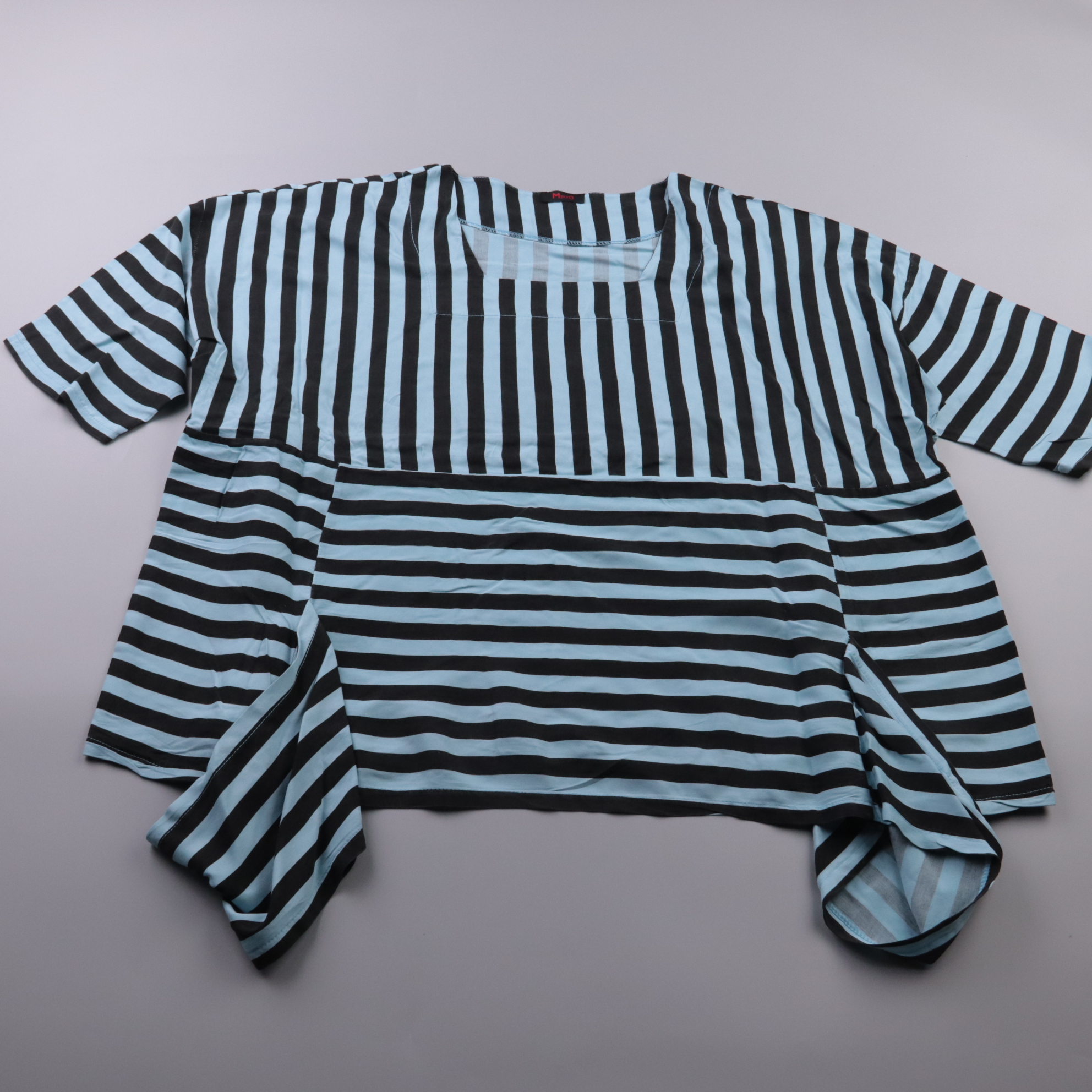 Блузка Mexx из 100% вискозы в чёрно-голубую полоску, с комбинированным направлением полос (вертикаль/горизонталь). Подойдёт для офиса и на каждый день, хорошо смотрится с джинсами или однотонными брюками. Вискоза лёгкая и комфортная, ткань приятная к т...