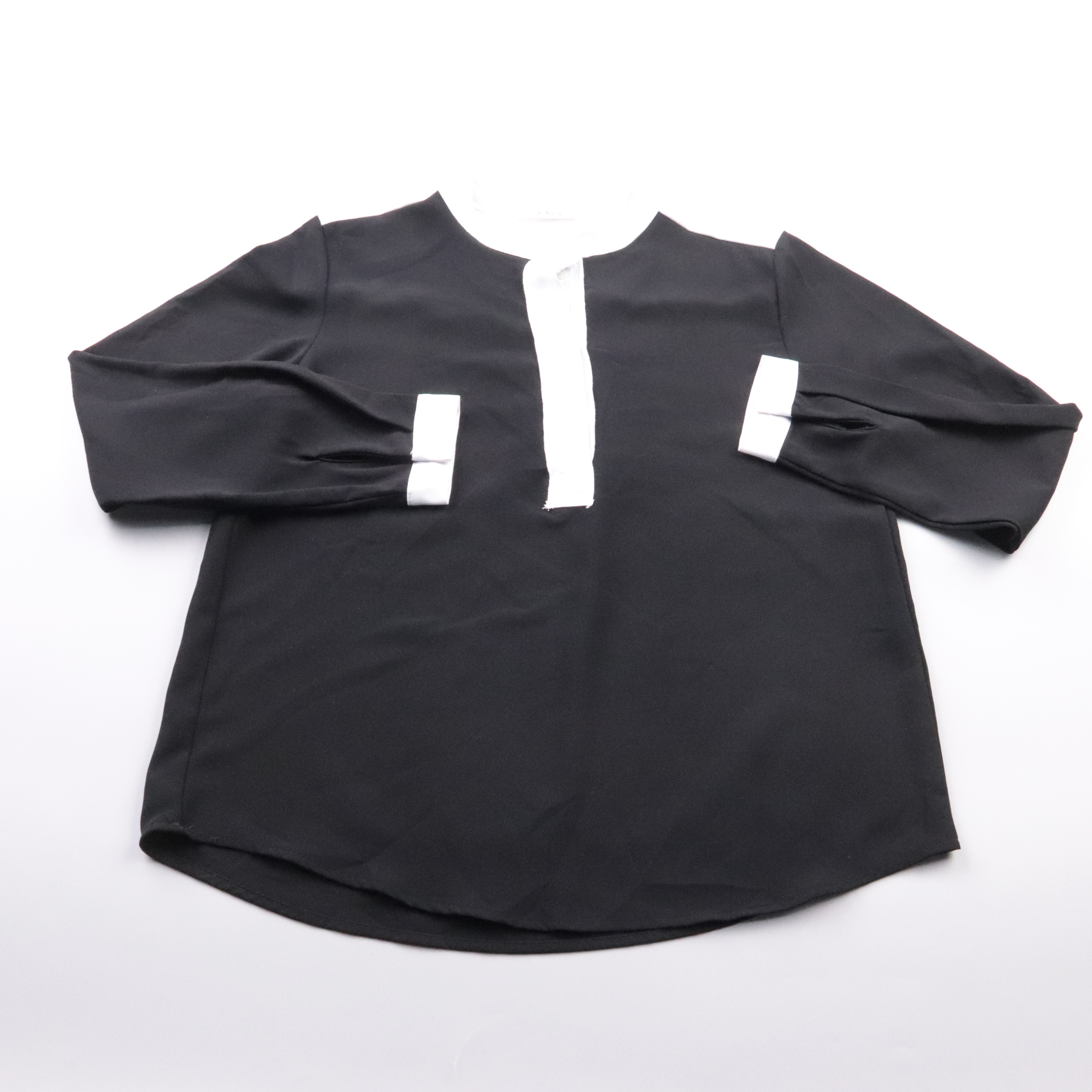 Блузка Grand чёрного цвета с контрастной белой планкой и манжетами, длинный рукав. Подойдёт для офиса и повседневных образов, легко сочетается с брюками и юбками. Практична тем, что тёмная ткань менее маркая и смотрится аккуратно.