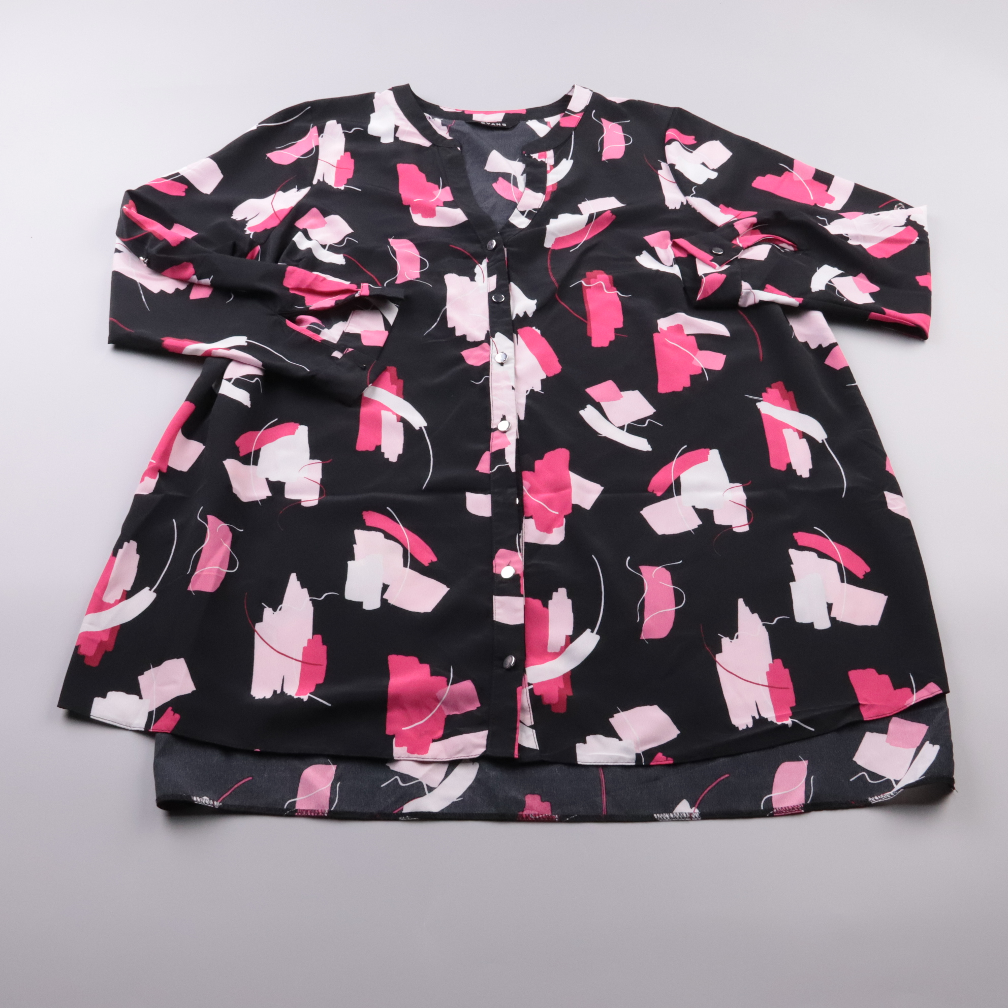 Блузка Evans с абстрактным принтом в розово-белых тонах на чёрном фоне и V-образным вырезом на пуговицах. Подойдёт для офиса и на каждый день, хорошо смотрится с однотонными брюками или джинсами. Лёгкий полиэстер почти не мнётся и быстро сохнет.
