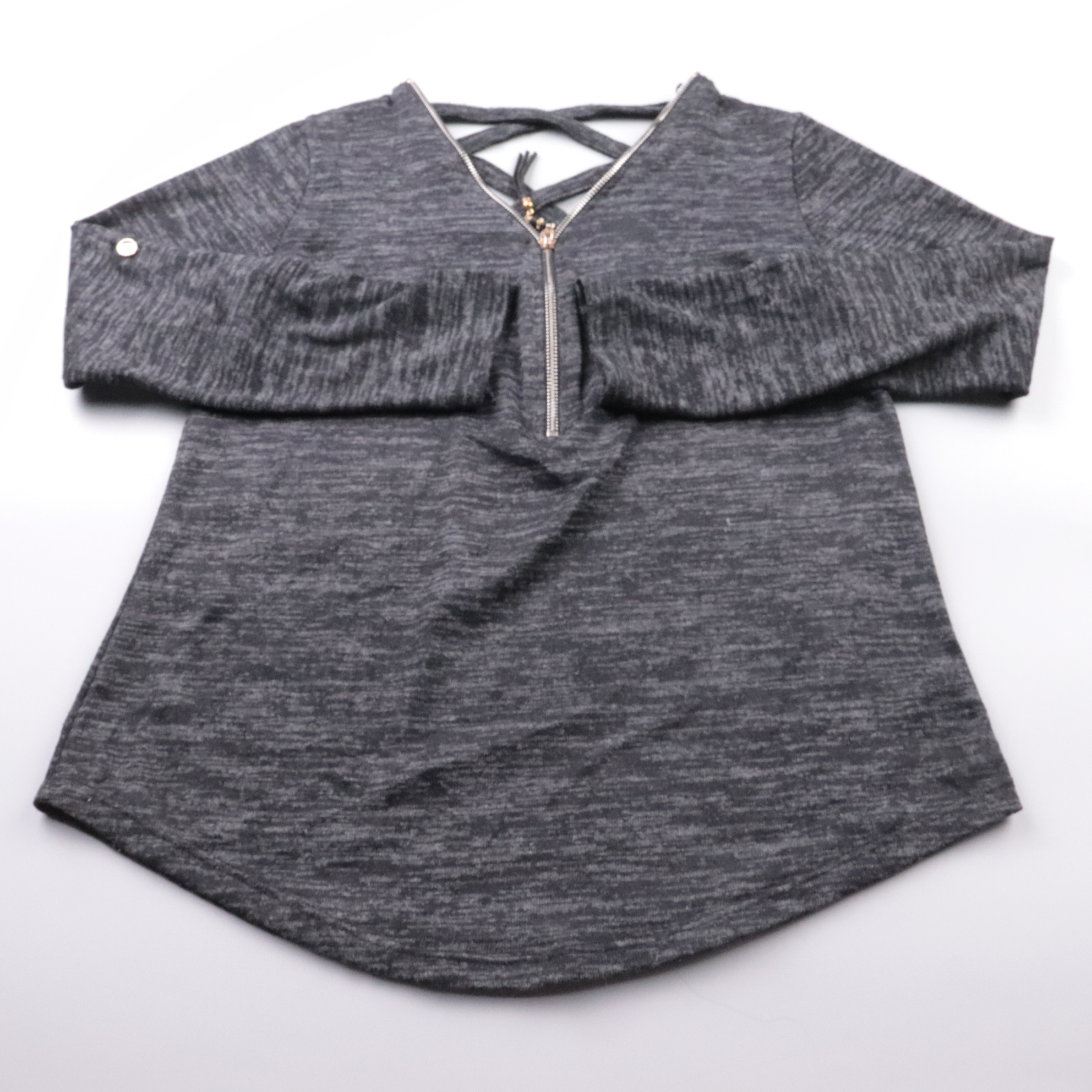 Женская блузка из трикотажа меланжевого тёмно-серого цвета, с декоративной молнией спереди и переплётом лямок на спинке. Подойдёт для повседневных образов и офиса в стиле casual, хорошо сочетается с джинсами и юбками. Практичный плюс — мягкий материал ...