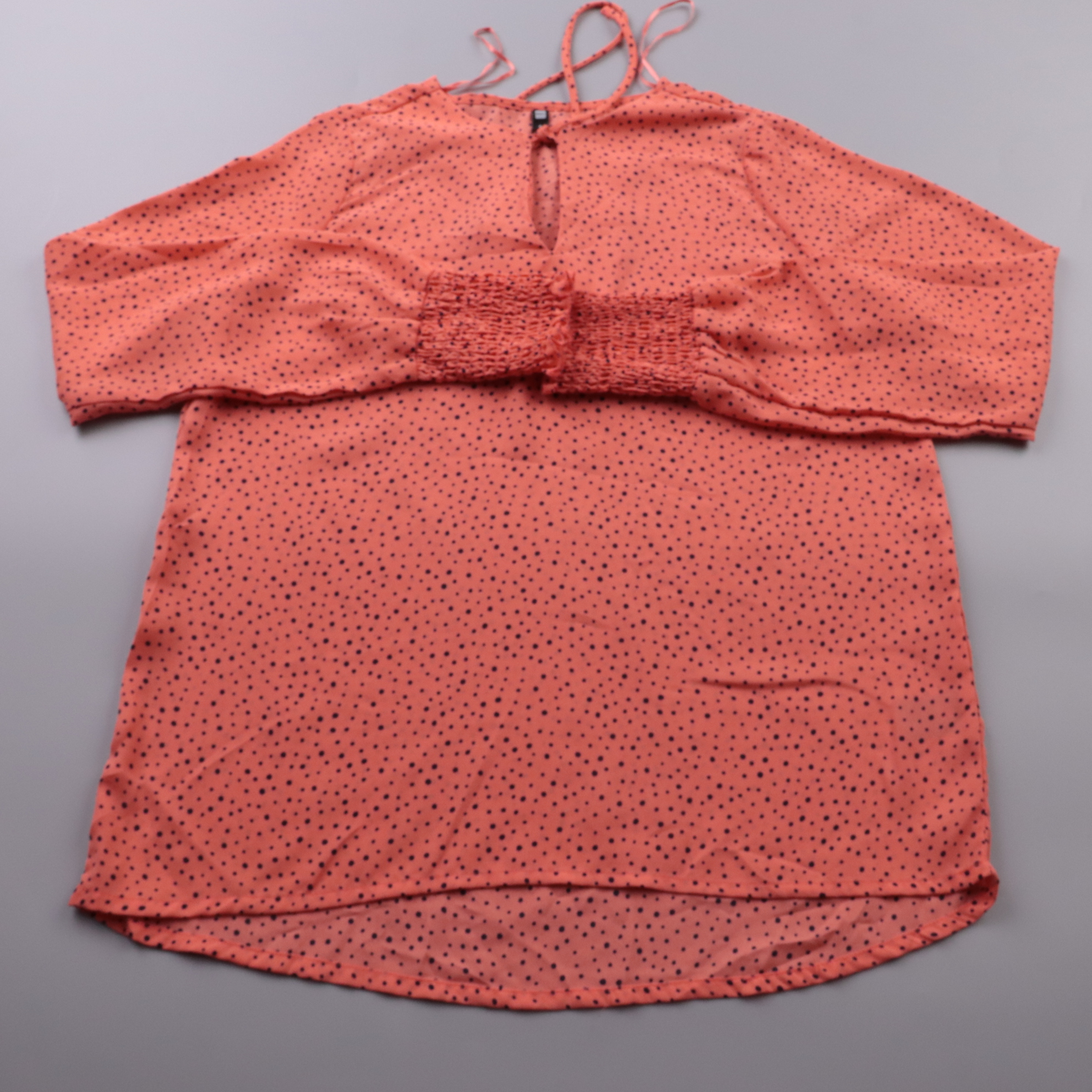 Блузка HEMA кораллового цвета в тёмный горошек, с завязками у горловины и вставкой-сборкой на талии. Подойдёт для повседневных образов и офиса с однотонным низом. Лёгкая ткань из полиэстера почти не мнётся и быстро сохнет.