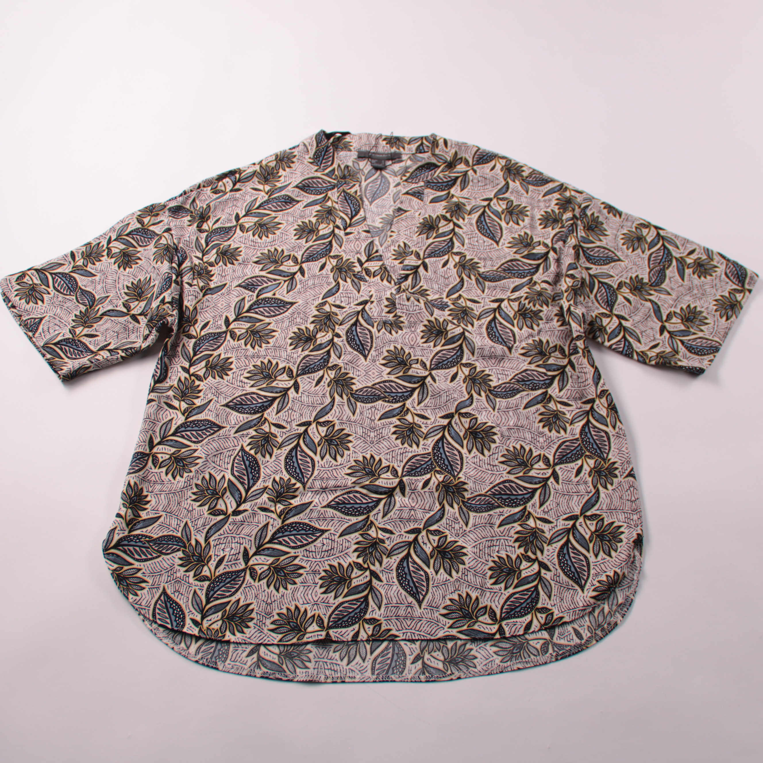 Лёгкая блузка Primark с коротким рукавом и растительным принтом в спокойной палитре. Подойдёт для лета и тёплой погоды, хорошо смотрится с джинсами, шортами или однотонной юбкой. Практичный плюс — ткань из полиэстера почти не мнётся и быстро сохнет.