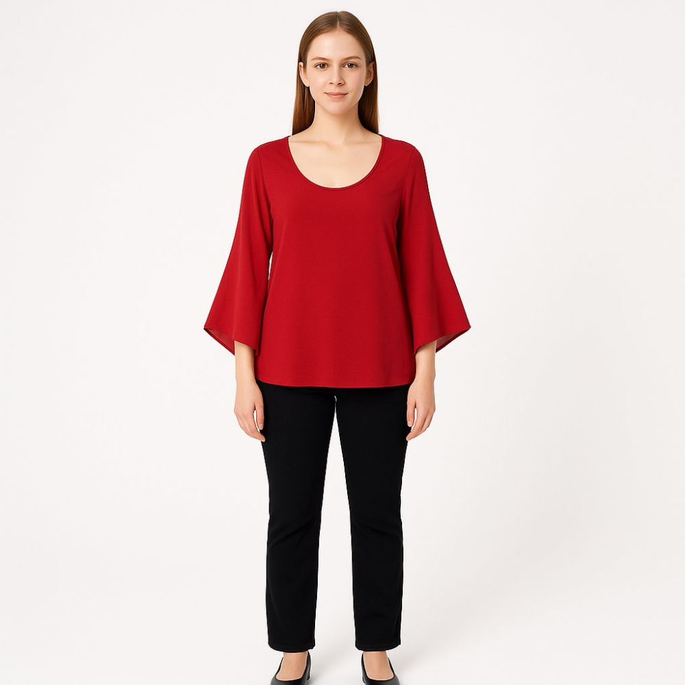 Женская блузка F&F красного цвета с широкими рукавами 3/4 и округлым вырезом. Подойдёт для офиса и повседневных образов, хорошо сочетается с брюками и джинсами. Лёгкая ткань из полиэстера почти не мнётся и быстро сохнет.