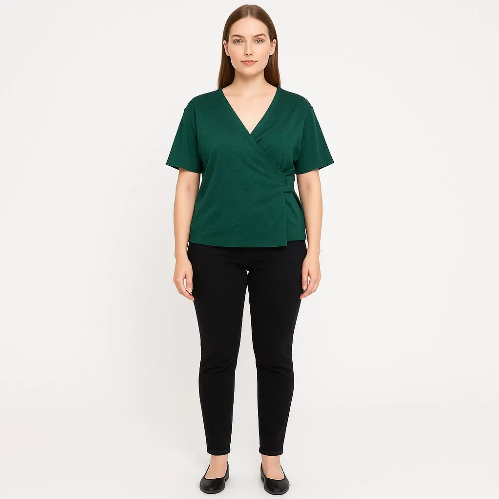 Женская блузка Lindex тёмно-зелёного цвета с запахом и V-образным вырезом. Подойдёт для офиса и повседневных образов, легко сочетается с брюками и джинсами. Практичный плюс — лаконичный крой и комфортная посадка для разных типов фигуры.