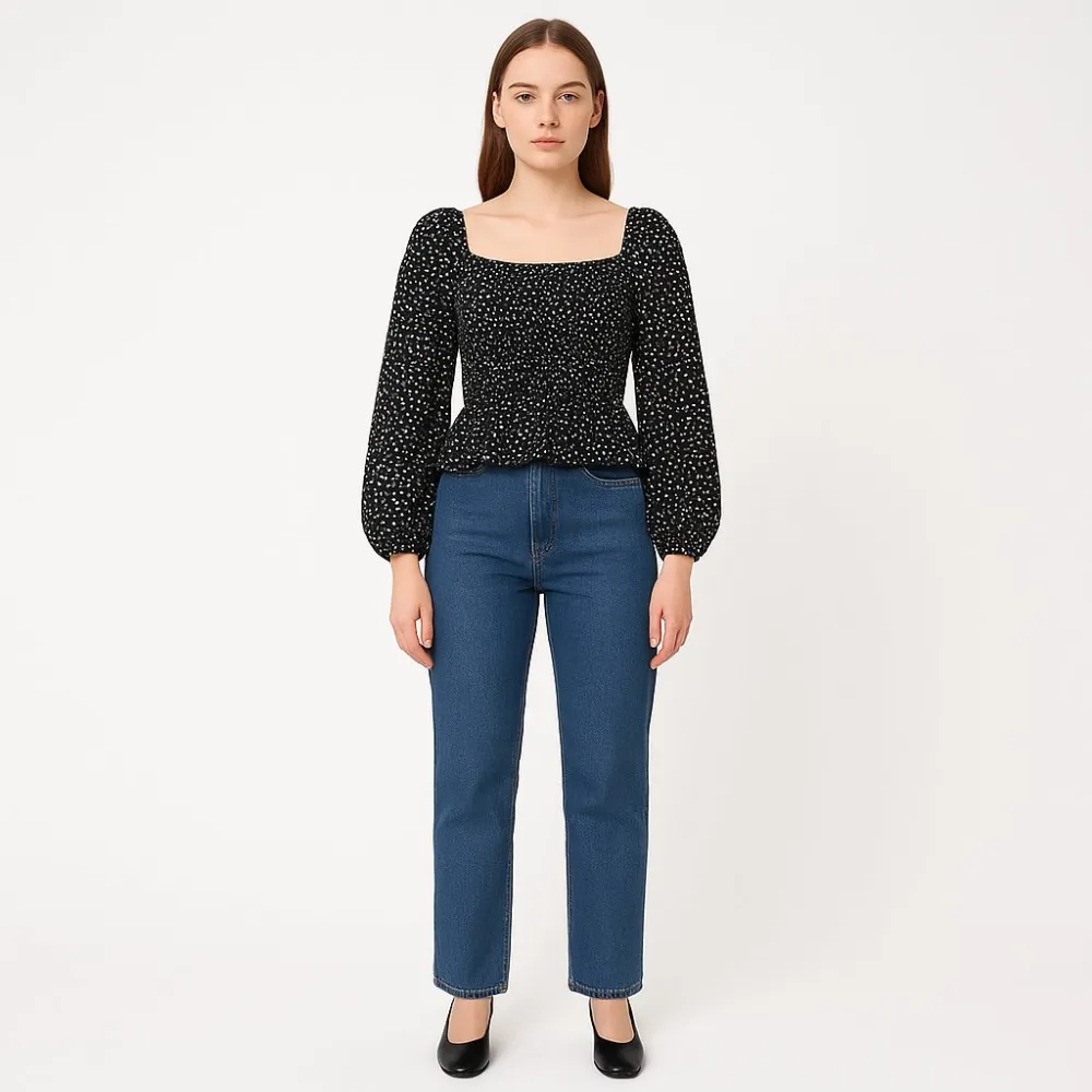 Блузка Dorothy Perkins из вискозы с добавлением эластана, чёрная в мелкий светлый принт и с квадратным вырезом. Подойдёт для повседневных образов с джинсами или юбкой в любое время года. Материал мягкий и тянется, поэтому удобно садится по фигуре.