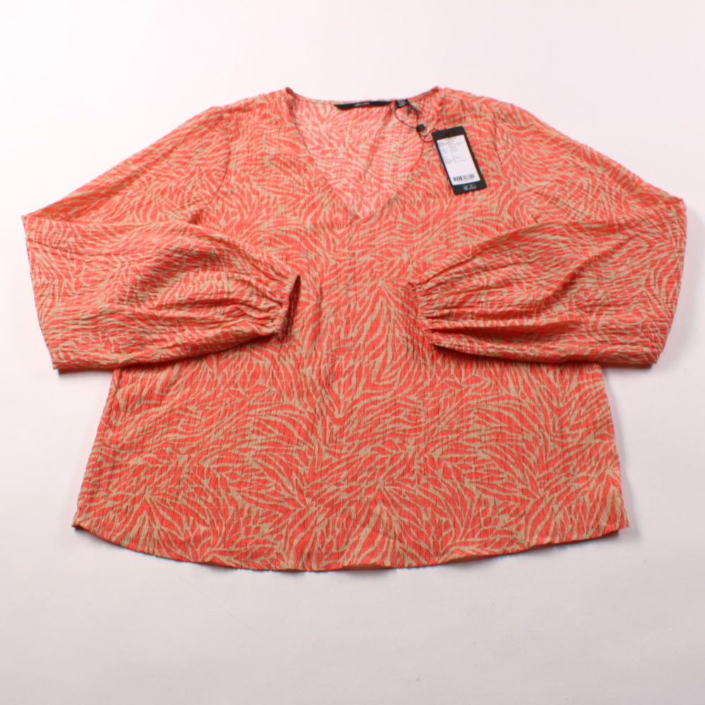 Блузка Vero Moda с V-образным вырезом и длинными рукавами, выполнена в красно-бежевом принте. Подойдёт для повседневных образов и офиса в сочетании с брюками или джинсами. Лёгкий полиэстер почти не мнётся и быстро сохнет.