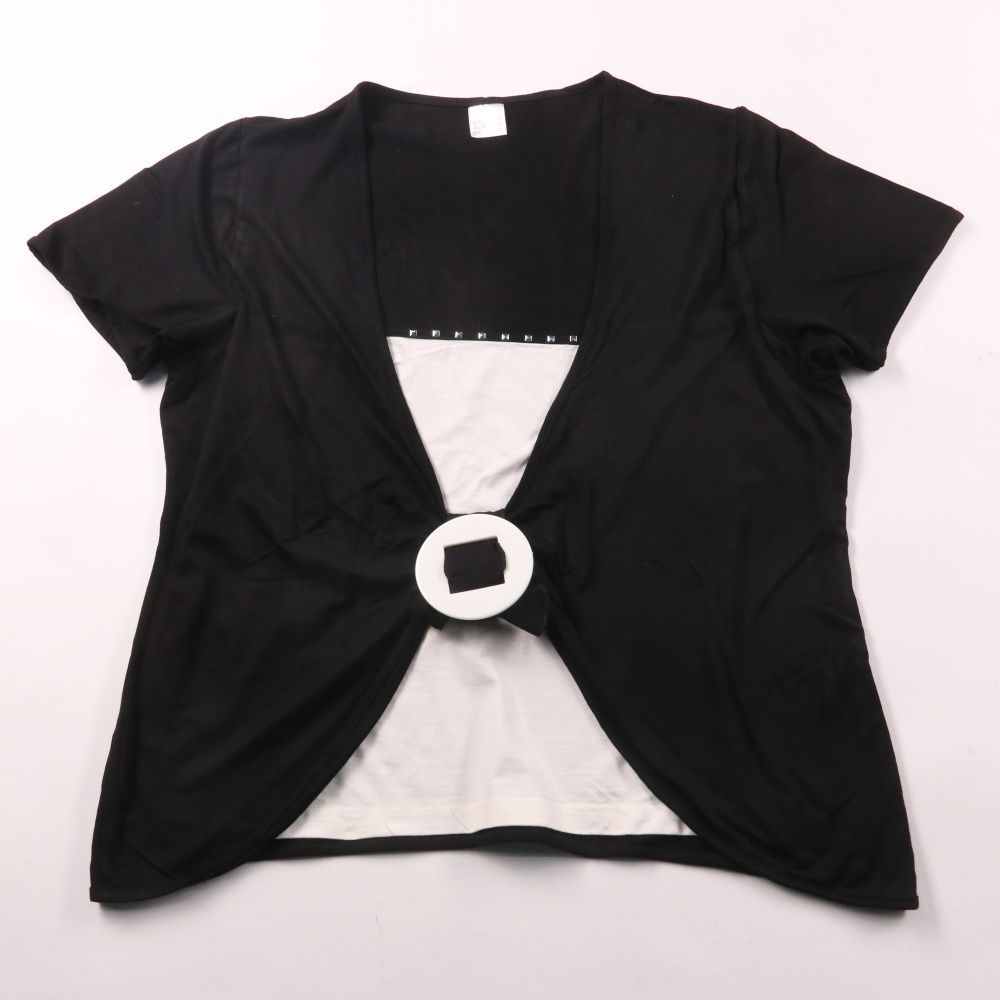 Женская чёрная блузка-накидка с коротким рукавом и глубоким V-вырезом, фиксируется декоративной пряжкой спереди. Подойдёт для офиса или повседневных образов, легко сочетается с топом/платьем и брюками. Ткань на основе вискозы тянется и комфортно сидит ...