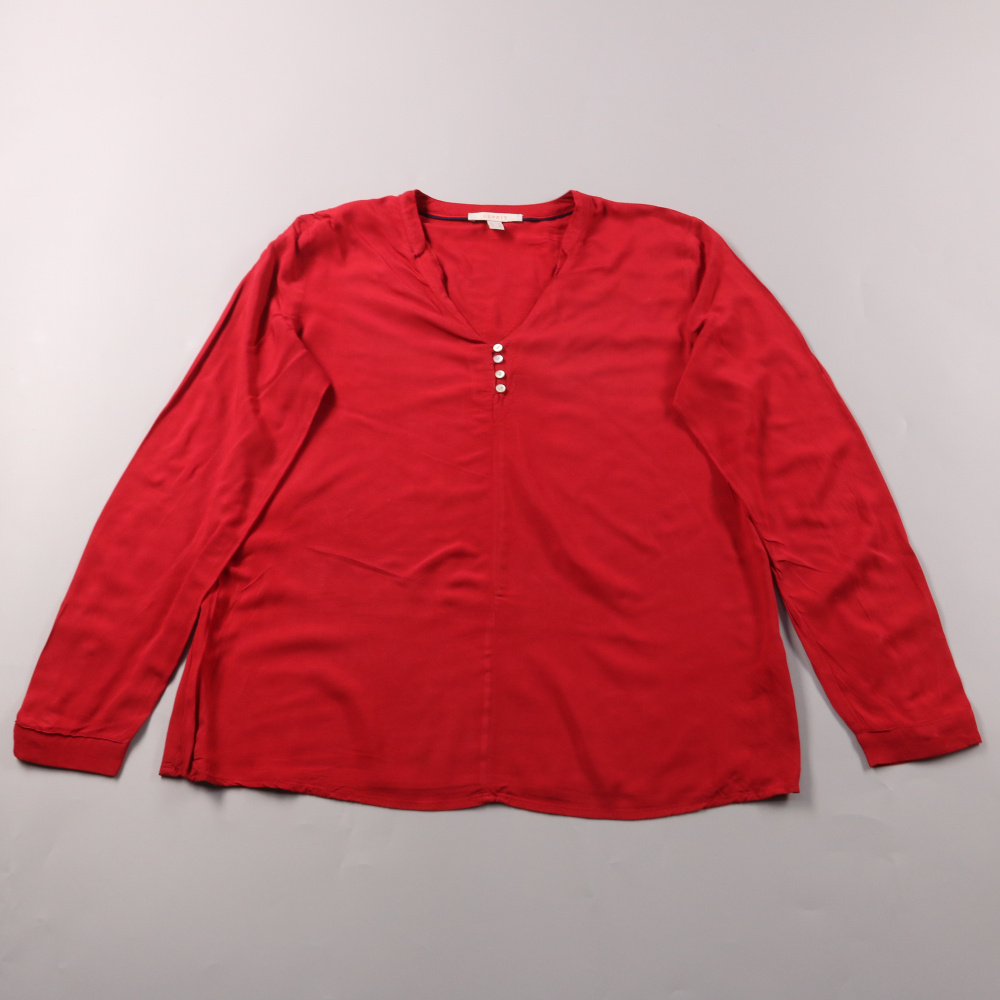 Блузка Esprit красного цвета с V-образным вырезом и планкой на пуговицах. Подойдёт для офиса и повседневных образов, легко сочетается с брюками и джинсами. Длинный рукав делает её удобной для прохладной погоды и многослойных комплектов.