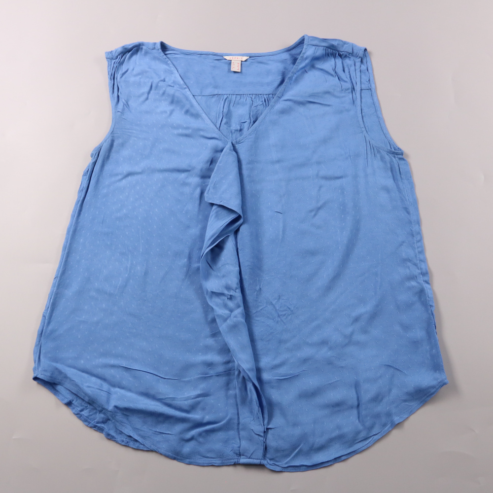 Лёгкая блузка Esprit голубого цвета без рукавов, с V-образным вырезом и декоративной складкой/воланом спереди. Подойдёт для тёплой погоды и офисных или повседневных образов с брюками и юбками. Тонкая ткань хорошо пропускает воздух и комфортно носится.