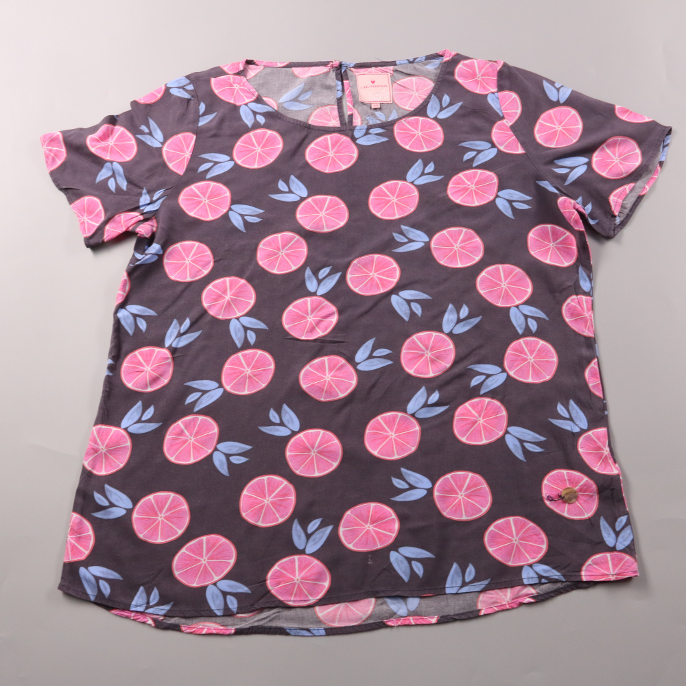 Блузка Lieblingsstück из 100% вискозы, тёмно-серая с ярким принтом в виде розовых цитрусов. Лёгкая модель с коротким рукавом подойдёт для тёплой погоды и повседневных образов. Вискоза хорошо дышит и комфортна в носке.
