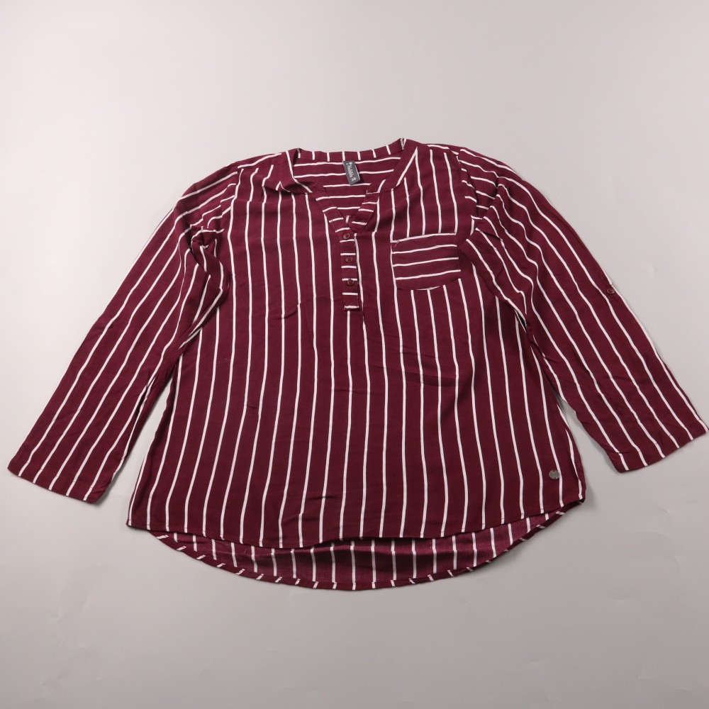 Блузка Street One бордового цвета в белую вертикальную полоску, с V‑вырезом и планкой на пуговицах. Подойдёт для офиса и повседневных образов с джинсами или брюками. Практичный плюс — лёгкая ткань и удлинённая спинка, удобно носить навыпуск.