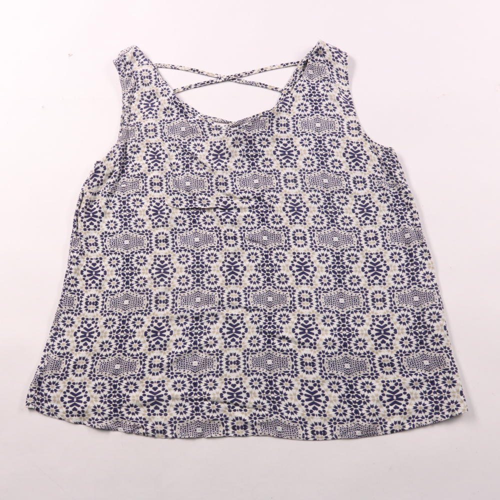 Топ Atmosphere белого цвета с синим геометрическим принтом и перекрёстными бретелями на спине. Подойдёт для лета и отпуска, хорошо смотрится с шортами, джинсами или юбкой. Лёгкая ткань и свободный крой обеспечивают комфорт в жаркую погоду.