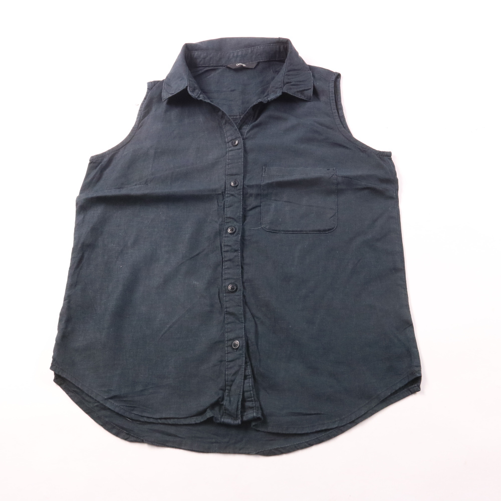Женская блузка George без рукавов, на пуговицах, с нагрудным карманом и отложным воротником. Подойдёт для лета и тёплого офиса, легко сочетается с джинсами, шортами или юбкой. Льняная ткань с вискозой хорошо пропускает воздух и комфортна в жару.