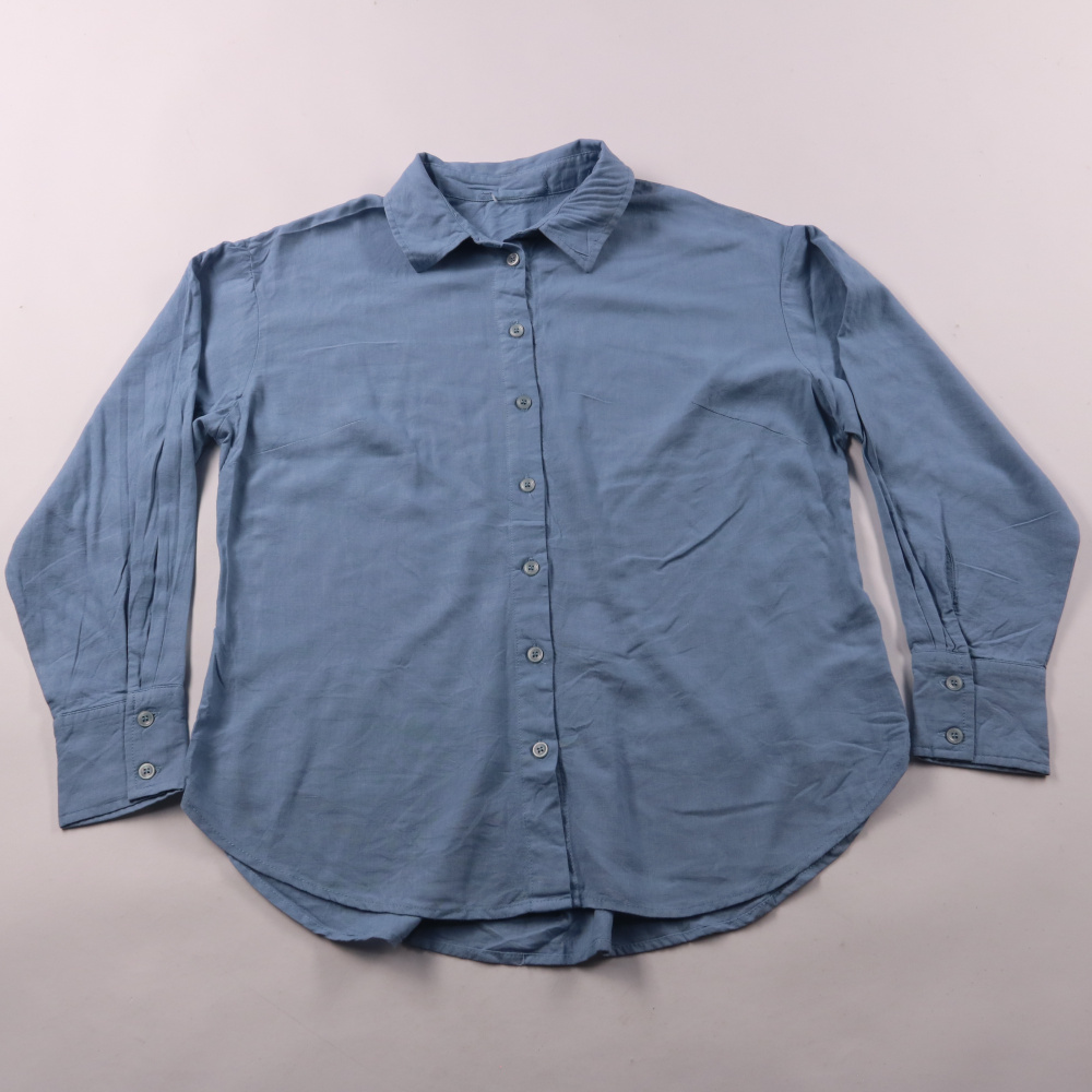 Женская рубашка голубого цвета с длинным рукавом и застёжкой на пуговицы, без указанного бренда. Подойдёт для офиса и повседневных образов, можно носить навыпуск или заправленной. Лёгкая ткань и манжеты на пуговицах делают её удобной для многослойных к...