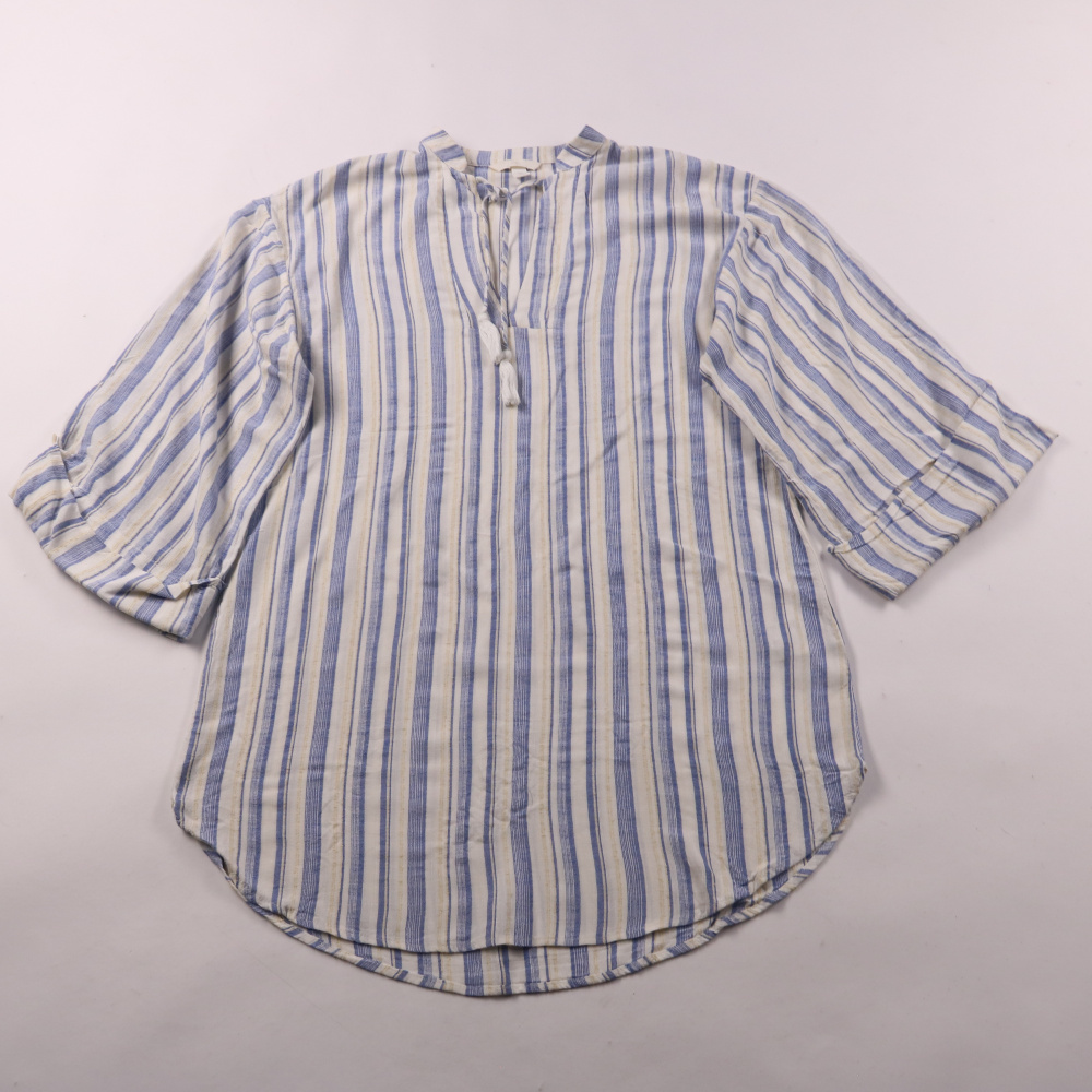 Блузка H&M в бело-синюю полоску с коротким рукавом и завязками у выреза. Подойдёт для тёплой погоды и повседневных образов с джинсами или шортами. Лёгкая вискозная ткань комфортно дышит и не перегружает образ.