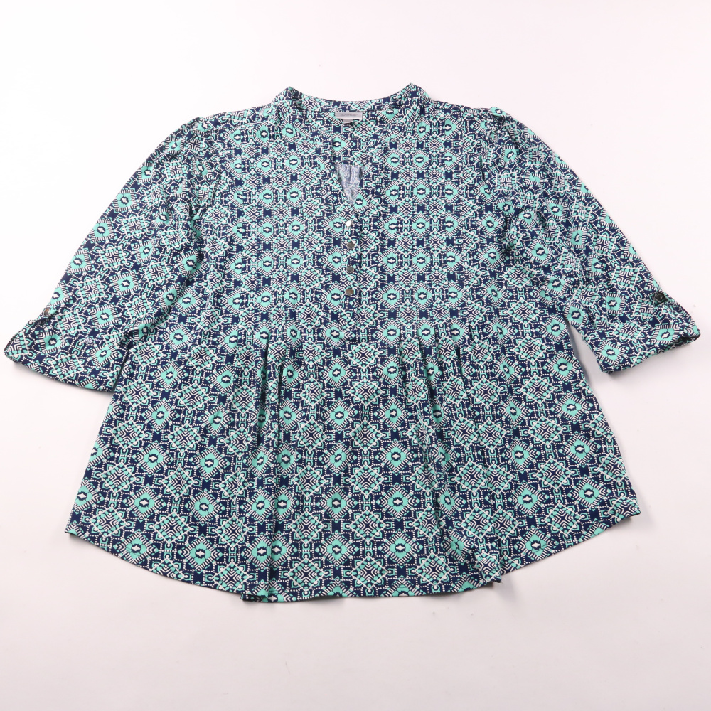 Женская блузка Avenue с геометрическим принтом в сине-бирюзовых тонах и свободным кроем. Подойдёт для повседневных образов, офиса без строгого дресс-кода и поездок. Ткань тянется и почти не мнётся, поэтому её удобно носить и брать с собой.