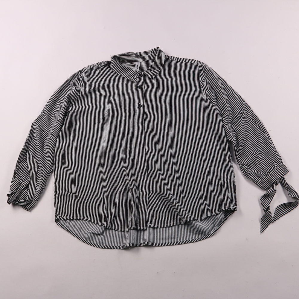 Полосатая блузка FB Sister в чёрно-белую вертикальную полоску, с воротником и пуговицами. Подойдёт для повседневных и офисных образов с джинсами или брюками. Лёгкая ткань и удлинённая спинка делают её удобной для носки навыпуск.